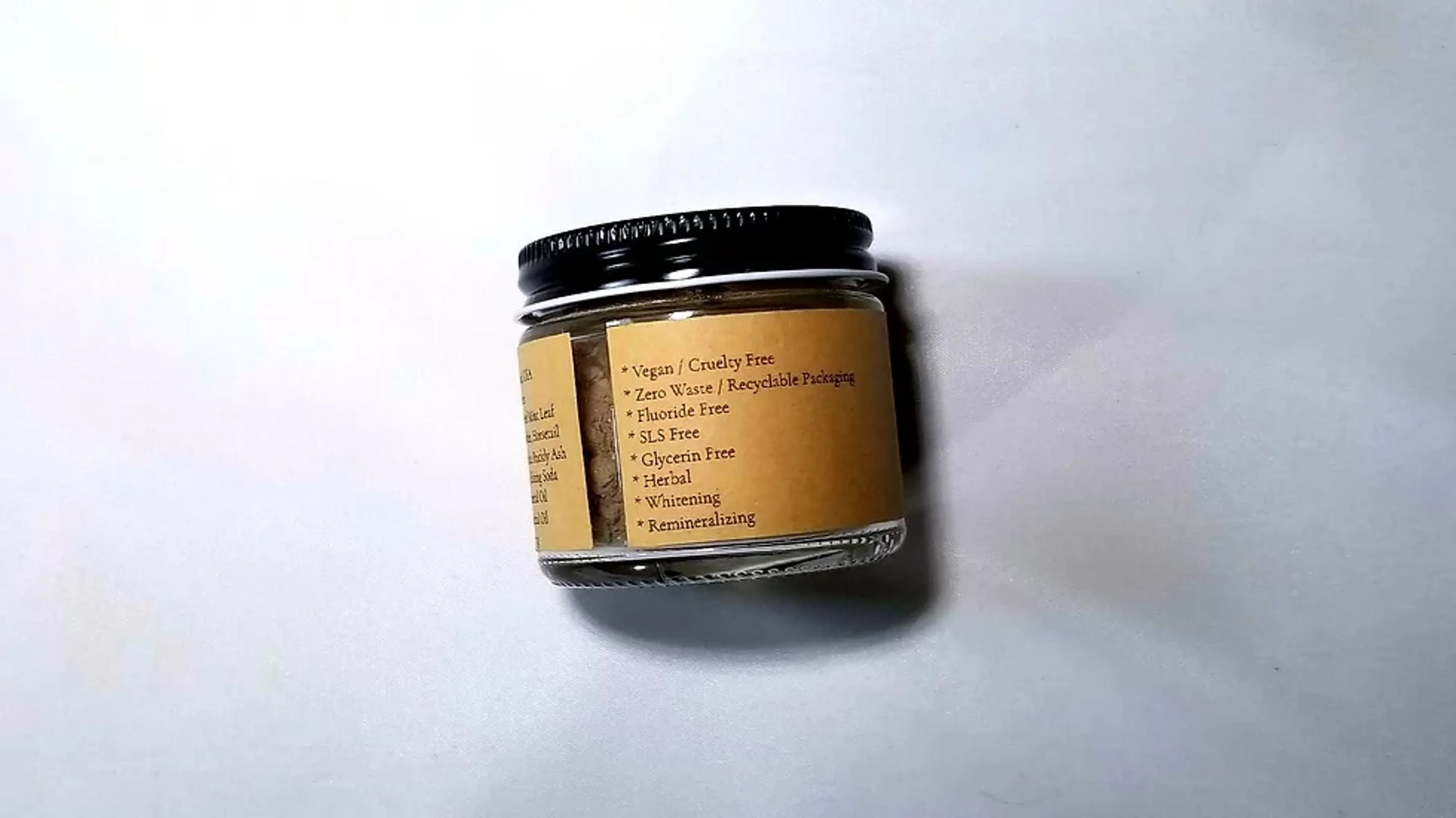 This dental powder comes in a 2 oz glass jar with a tin lid and recycled kraft paper label.