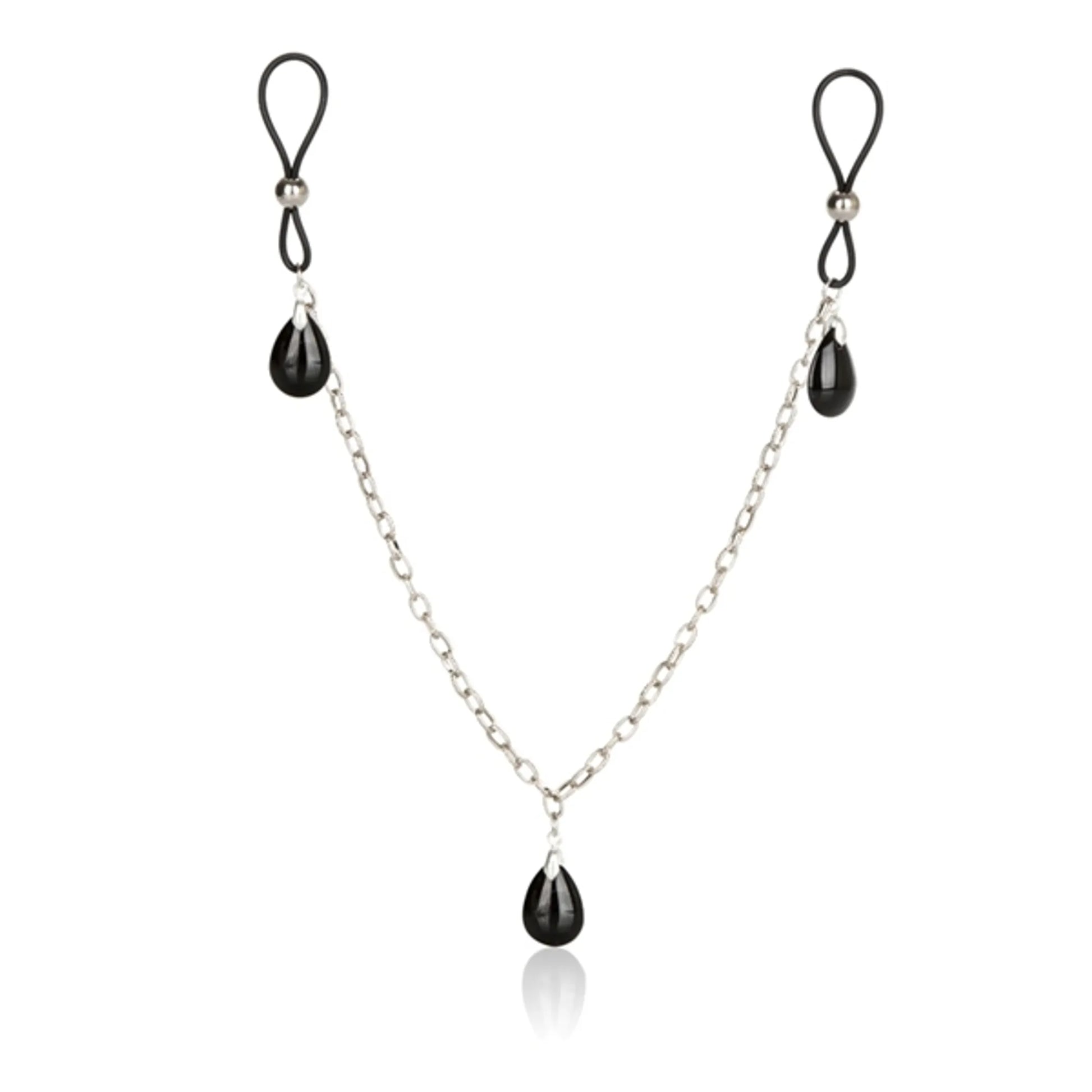 Nipple Play Non Piercing Nipple Chain Jewelry Onyx from California Exotic Novelties.The easy to wear, cinch design Nipple Play Non-Piercing Nipple Chain Jewelry is designed with your ultimate pleasure in mind. The seductive body jewelry shows off your intimate pleasure zones to maximum effect. Slip on the fully adjustable nipple adornment and enjoy tingling sensations, as the jewelry sways and stimulates the nipples. The set comprises of 2 adjustable nipple loops that are made from soft and super stretchy Silicone. The cinch design loops measure 2.5 inches and have Silver beaded adjusters that slide up and down, for an easy secure nipple grip. From the loops dangles a non-tarnishing, Nickel free Iron Chain that is decorated with a trio of teardrop shaped Onyx Crystals. The Nipple Jewelry can be worn as a statement fetish piece, or to tantalize and seduce your lover. The comfortable to wear jewelry is perfect for first time and experienced users. The sensual sparkling body jewelry is easy to wear and stimulates nipple sensitivity and intimate arousal. For an intensified erotic experience, use arousal gel for a long lasting erect nipple effect. Before and after use, clean the jewelry with a toy cleaner spray. Includes 2 fully adjustable nipple adornments. Soft and comfortable cinch design. Sturdy high quality chain for added sensuality. Non piercing, non tarnishing, nickel free. Safe and pure for body and pleasure made using phthalate free materials Nickel free Iron chain, beads, Silicone Loops, Crystal jewels. 2.5 inches each loop. 17 inches overall length. Bulk weight 0.7ounce. Specifications: SKU SE-2616-10-2. Color Black Onyx. 1 Year Warranty. Features: Wearable, Phthalate free, Adjustable. Material type: Nickel free Iron Chain, Beads, Silicone Loops, Crystal Jewels. Measurements: 2.5 inches each Loop. 17 inches overall length. Bulk weight 0.7ounce. Package 2 ounces. Package: 0.75 inch by 5.5 inches by 8.5 inches. Categories: Bondage, Fetish, Kink, Nipple Play, Sex Toys for Women, Pasties, Accessories. 2023.