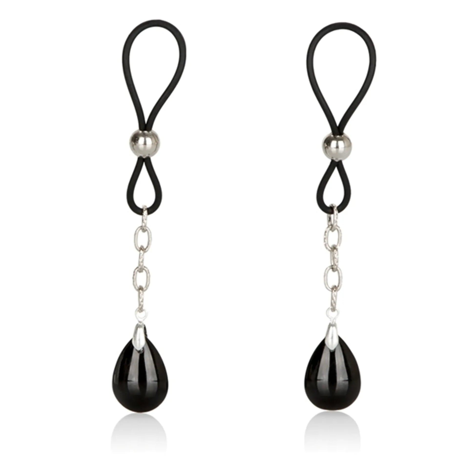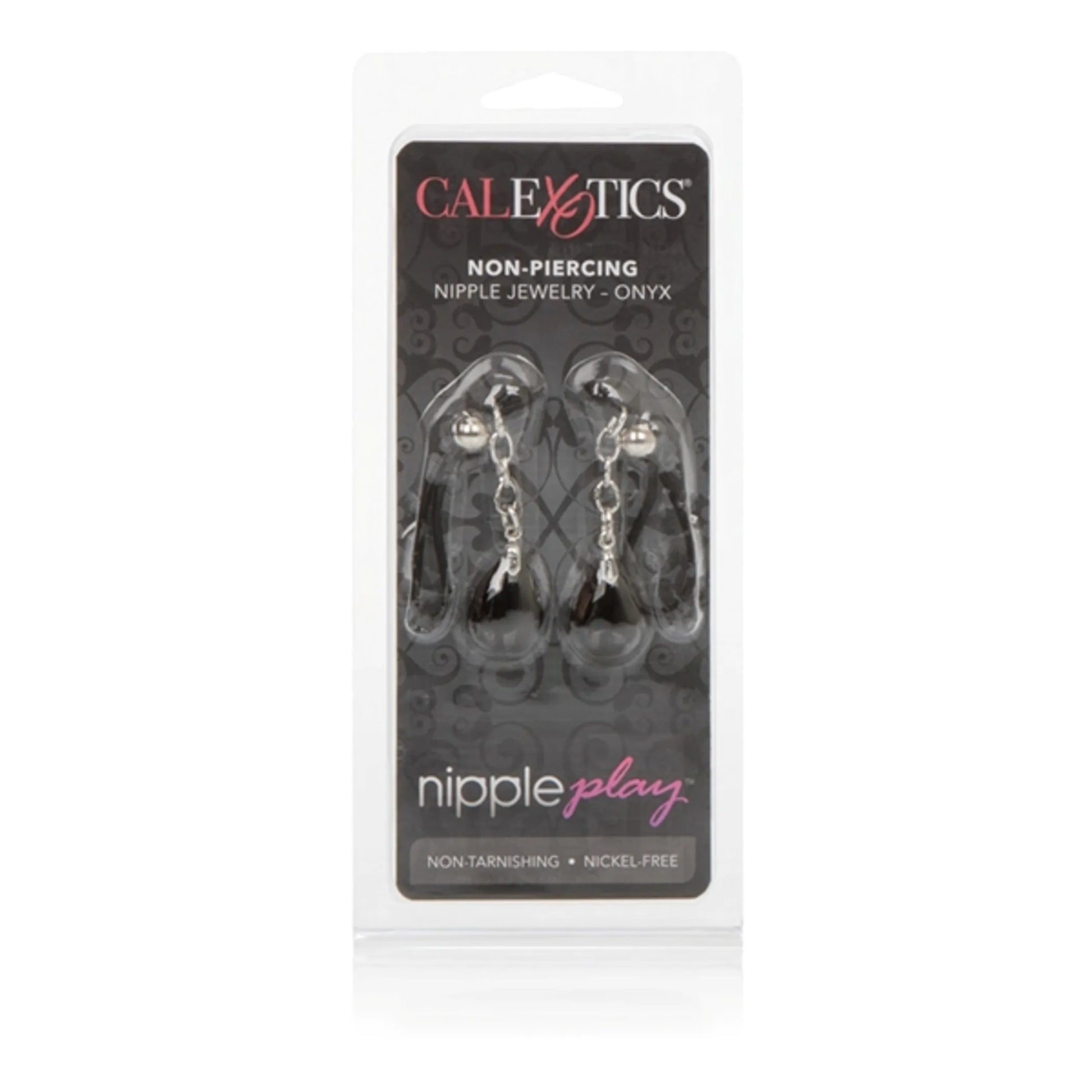 Nipple Play Non-Piercing Nipple Jewelry Onyxfrom California Exotic Novelties. Create a lasting erotic impression with the Nipple Play Non-Piercing Nipple Jewelry. The easy to wear, fully adjustable nipple adornments make a sensual statement, and are ideal for first time and experienced users. Slip the ultra feminine crystal jewelry over the nipple, and secure in place, for a tantalizing exotic display. The set comprises of a pair of fully adjustable, non-piercing Nipple adornments that are comfortable to wear, and erotically fashionable. The non-tarnishing, Nickel free Iron chains are attached to super soft and stretchy Silicone loops that provide a comfortable cinch design. The flexible loops measure 2.25 inches for the perfect fit and are adorned with beaded adjusters. Smooth clear crystal pendants tangle seductively from the jewelry chain and add a delightful tingle sensation. Use the decorative jewelry for seduction or fetish play. Lovers of extended Nipple play will enjoy the additional visual stimulation that the sparkling onyx danglers provide. Surprise your lover by slipping on the Nipple jewelry and issuing an invitation to play. To heighten the sensual sensations apply arousal gel directly to the nipple, for a long lasting erect nipple effect. Before and after every use, clean the nipple jewelry with a toy cleaner spray. Includes 2 fully adjustable nipple adornments. Soft and comfortable cinch design. Non-piercing, non-tarnishing, Nickel free body jewelry. Safe and pure for body and pleasure made using phthalate free materials Nickel free iron chain, beads. Silicone loops. Crystal jewels. 2.25 inches each loop. 4.5 inches overall length. Bulk weight 0.5 ounce. Specifications: SKU SE-2615-10-2. Color Onyx Black. 1 Year Warranty. Features: Wearable, Phthalate free, Adjustable. Material type: Nickel free Iron Chain, Beads, Silicone Loops, Onyx Jewels. Measurements: 2.25 inches each Loop. 4.5 inches overall length. Bulk weight 0.5 ounce. Package 1.1 ounces. Package: 0.75 inch by 3.25 inches by 7.5 inches. Categories: Bondage, Fetish, Kink, Nipple Play, Sex Toys for Women, Pasties, Accessories. 2023.