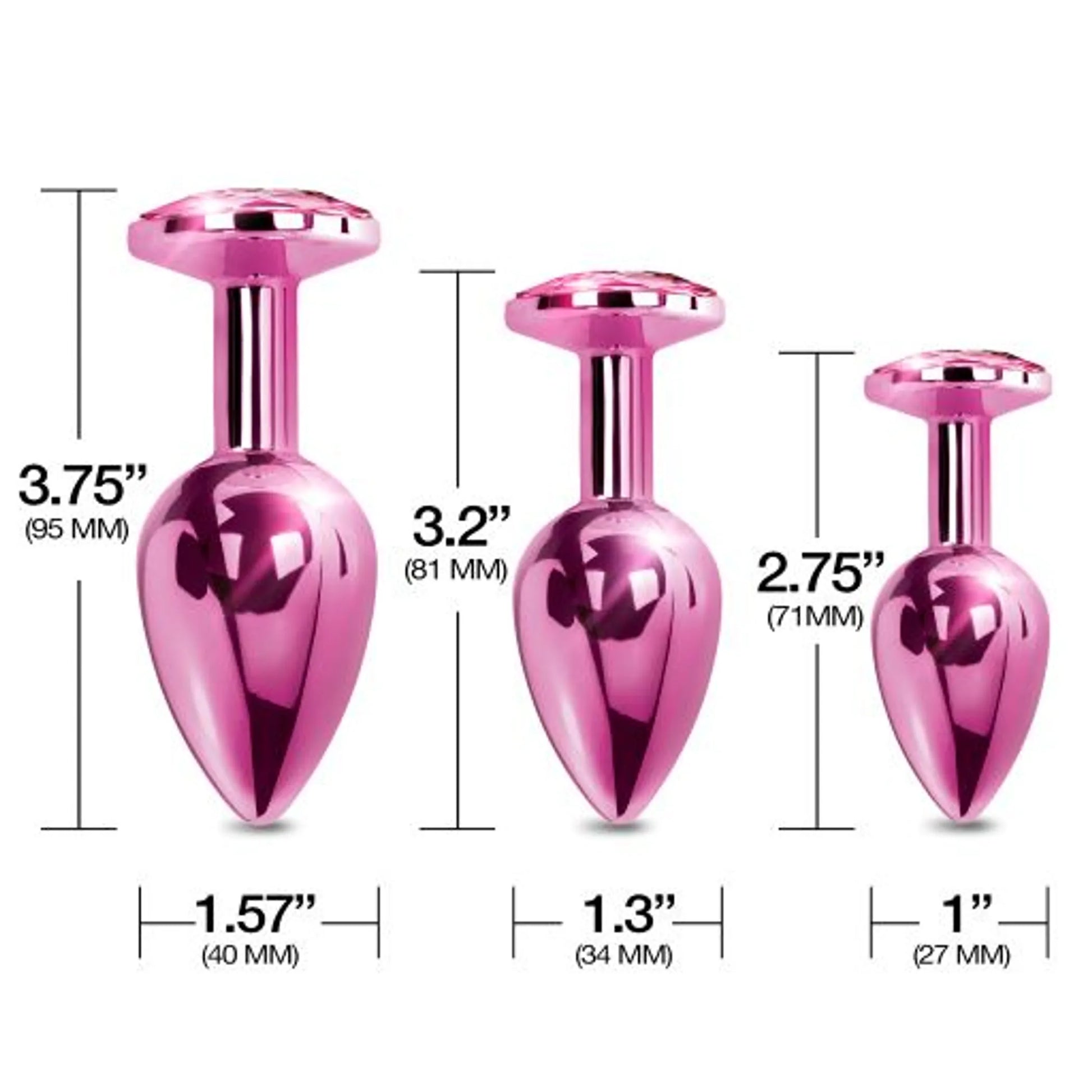 Nixie Metal Plug Trainer Set Pink Metallic 3 Graduated Butt Plugs from Global Novelties. Adorn your derriere with a dazzling pink jeweled anal plug! Smooth plated slick metal finish plugs in light weight Aluminum alloy. Graduated sizes in this anal training kit let you start small and train your way up to more adventurous pleasures. Tapered tip and seamless smooth, seamless material assure an easy insertion. Free bonus storage bags for each plug. Easily warmed or cooled for temperature play. Body safe and eco-friendly. Small Butt Plug measures 2.75 inches by 1 inch, medium butt plug 3.2 inches by 1.3 inches and a large butt plug measures 3.75 inches by 1.57 inches. Categories: Anal Toys, Small, Medium Butt Plugs, Sex Toys for Couples, Sensual Kits, Anal Trainer Kits. 2023.