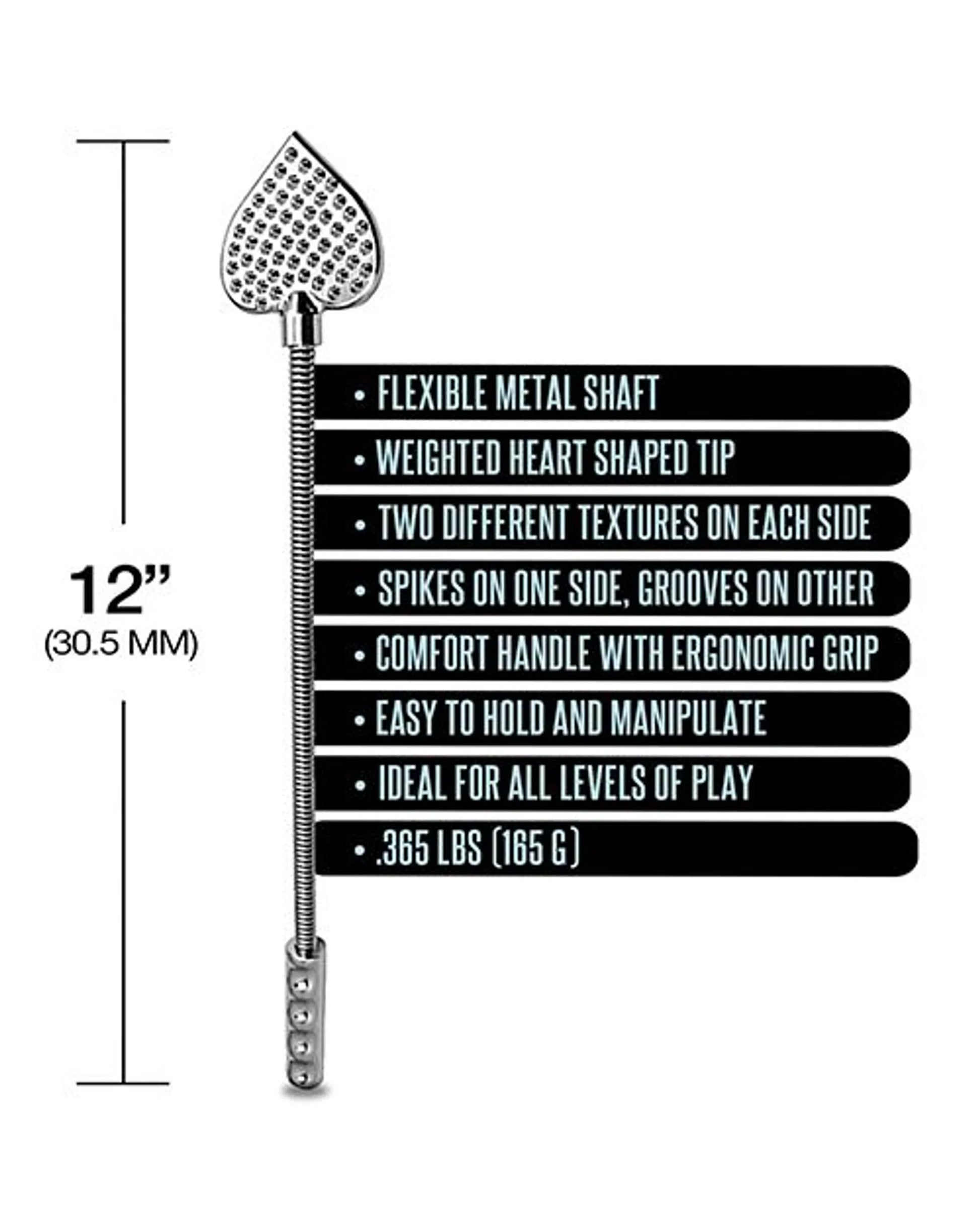 Nixie Stainless Steel Riding Crop Heart from Global Novelties. Nixie Flaming Heart Riding Crop. Flexible shaft with weighted heart tip, makes this crop the ideal choice for both novice and extreme levels of kinky play. Spanking crop surface has texturing over both side, leaving a lasting impression. Size 12 inches in length. Bulk weight .365 pound. Categories: Bondage, Fetish, Kink, Naughty Role Play, Valentine's Day, Sex Toys for Couples, Men, Women, Whips, Paddles, Crops, Impact, Ticklers. 2024.