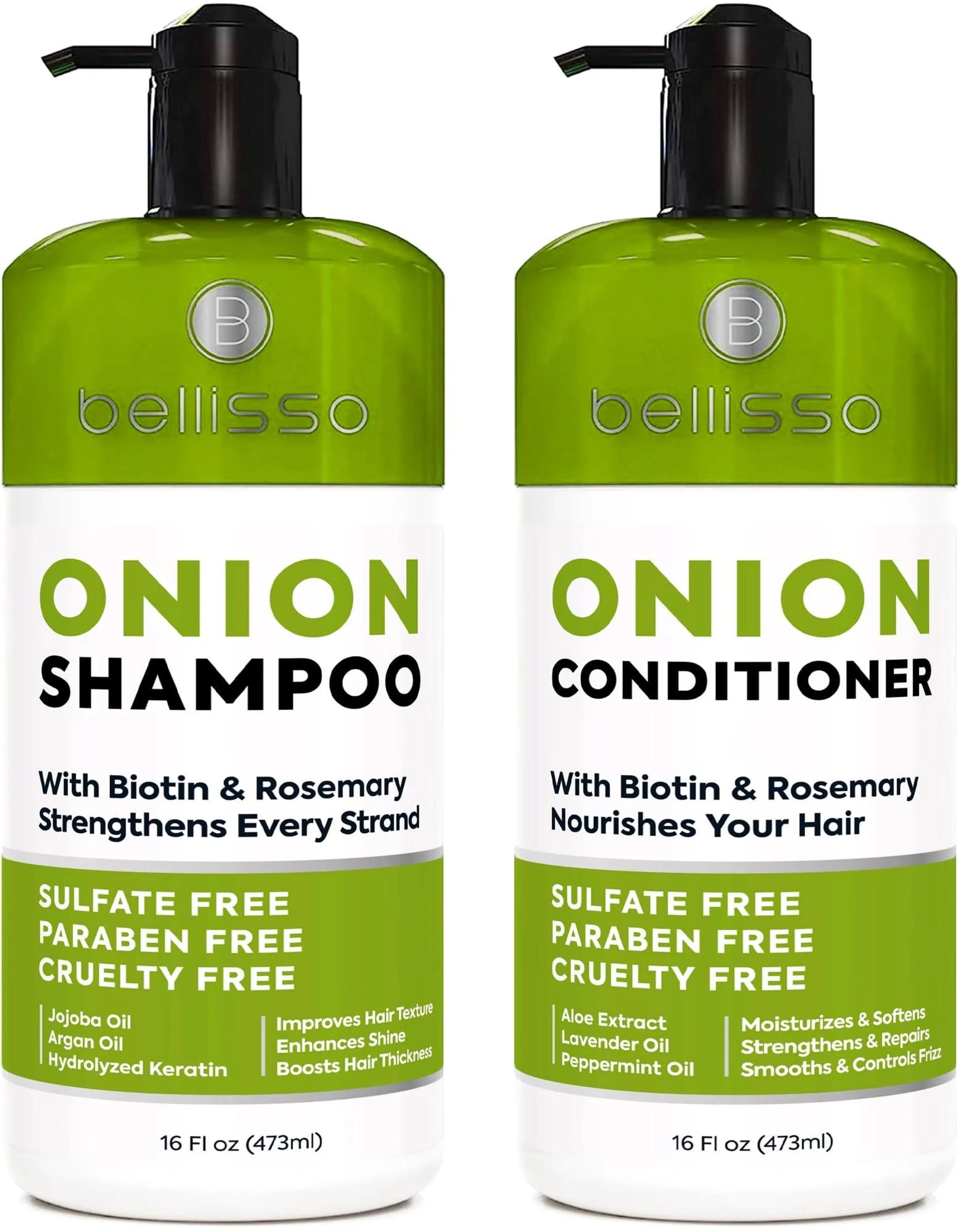 THICKENING FORMULA: People with thinning hair love how Bellissos onion shampoo and conditioner set can help boost thickness. The secret to our volumizing shampoo and conditioner is the way it forms a coating around each strand, helping to increase space between the hair for a fuller appearance. When youre in search of a hair thickening shampoo for women and men that actually works, Bellissos onion and biotin shampoo and conditioner is the answer. BOTANICALLY ENRICHED: Our volume shampoo and conditioner set contains plant extracts to help stimulate scalp circulation. With rosemary and peppermint oil to help promote blood flow, this thickening shampoo and conditioner is ideal for people who want more from their hair care products. Whats more, our onion rosemary shampoo set wont upset your scalps pH. Trust only Bellisso for a rosemary onion shampoo and conditioner that puts your hairs health first. WITH BIOTIN: Bellissos thickening shampoo and conditioner for women and men contains biotin for an added boost. Specifically chosen to promote a more voluminous feel, this conditioner and shampoo for thinning hair is the solution for people who want luscious locks they can run their fingers through. Turn heads for all the right reasons with this premium onion rosemary biotin shampoo and conditioner from Bellisso. SALON GRADE: If youre in search of a salon shampoo and conditioner set thats trusted by experts, this onion and rosemary shampoo and the smarter choice. Our thinning hair shampoo and conditioner has been formulated by professionals and tested in real world conditions. Take your appearance to the next level with this advanced shampoo and conditioner for thinning hair. SULFATE FREE: Say goodbye to conditioner and shampoo for thin hair thats full of questionable ingredients. Bellissos shampoo and conditioner for thin hair is free from sulfates, parabens and phthalates. Better still, this sulfate free shampoo and conditioner is cruelty free and never tested on animals.