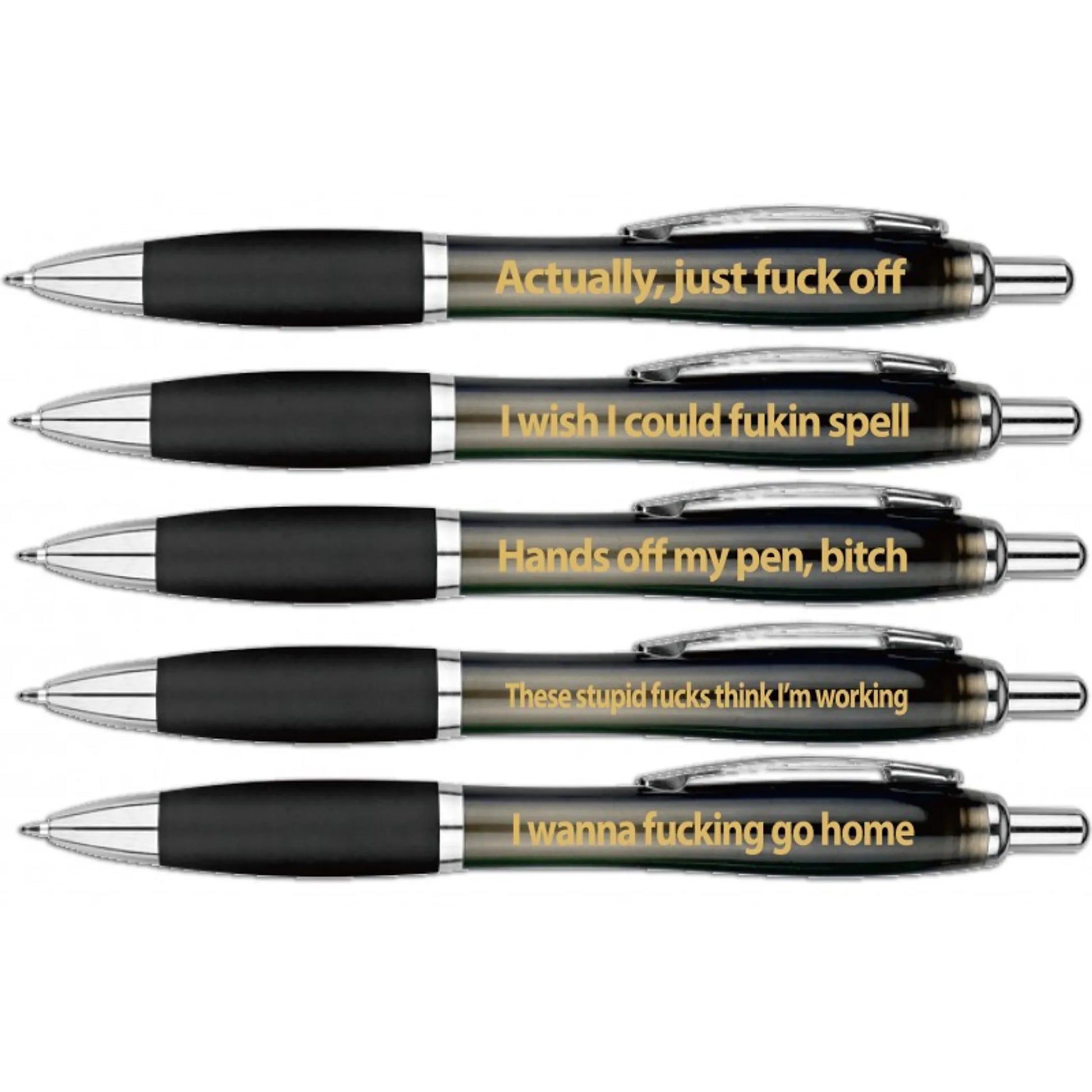 Outrageous Office Pens Despicable Pens For Writing Work Shit Down. Assorted Adult Sayings 5 Pack from Hott Products Unlimited. Want a pen that is really note worthy? Well now you can have fun and create hysterical laughter when you let a friend or coworker borrow your pen with these hysterical assorted sayings pens.Let people really know what is on your mind! Sayings include: Actually, just fuck off, I wish I could fukin spell, Hands off my pen, bitch, These stupid fucks think I'm working, I wanna fucking go home. Features: 5 Nasty Pens included. Great ice breaker. Fun novelty. Categories: Party Games, Gifts, Supplies, Adult Gags, Gifts and Novelties, Risque Office Supplies. Adults only please. 2023.