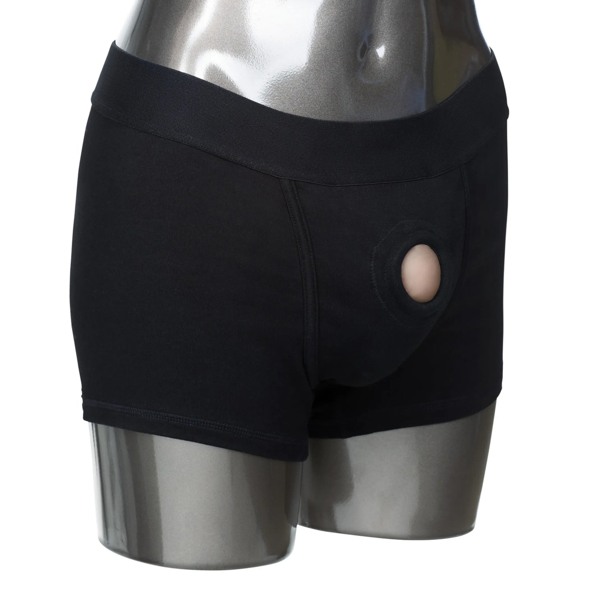 Packer Gear Black Boxer Harness M/L from California Exotic Novelties. Offering superior support and comfort, the Packer Gear Black Boxer Harness is designed for the ultimate instyle and comfort when fashioning your favorite Packer or Stimulator. The masculine cut Brief has a fashionable classic Boxer style, with internal Pockets to store your favorite vibrating stimulator. Insert a Packer, Probe or Dong, into the reinforced panel O-Ring, and get ready to enjoy sensual and mind blowing one on one action. The Packer Gear Black Boxer Harness is made from washable soft, stretchy Cotton, Spandex Blend and has an extra wide waistband for additional comfort and support. The Boxer?EUR(TM)s soft lining features discreet internal Pockets and an internal Strap to secure your preferred Packer securely in place. The reinforced 2 panel design also has a super stretchy O-Ring that easily accommodates most standard sizes of erotic and exotic Probes. The Boxer Harness delivers hands free satisfaction every time. Ideal for first time and experienced users, the Packer Gear Black Boxer Harness requires no external strap adjustments. The Boxer Harness Shorts slip on like underwear for an ultimate comfort fit. To experience orgasmic hands free penetration simply select your favorite Packer or Dong, and pair up with a Vibrating Stimulator for double the ecstasy and unforgettable fun. Discreet 2 panel design to accommodate Dual Penetration. Reinforced O-Ring stretches to accommodate most Packers, Dongs or Probes. Soft, stretchy and comfortable. Comfortable soft lining. Internal strap to secure your Packer in place. Packer not included. Internal pockets to add a favorite stimulator, not included. Washable. 95% Cotton, 5% Spandex. Bulk Weight: 3.1 ounces. Categories: Bondage, Fetish, Kink, Naughty Role Play, Strap-Ons, Harnesses, Sex Toys for Couples, Women, Body Harnesses. 2023.