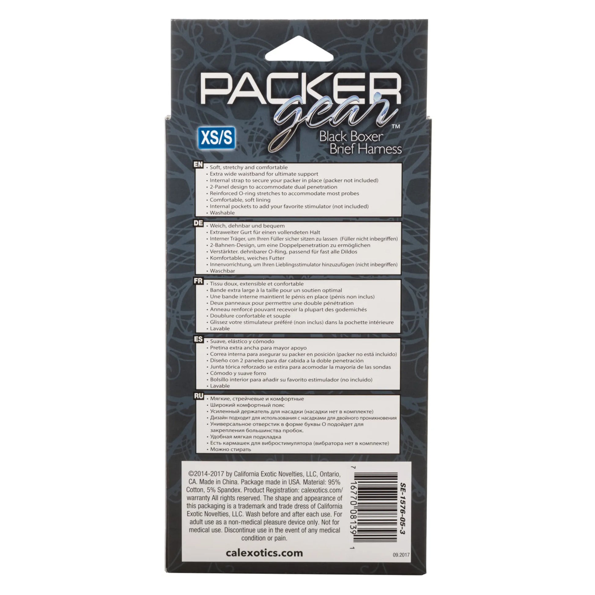 Packer Gear Black Boxer Harness XS/S from California Exotic Novelties. Offering superior support and comfort, the Packer Gear Black Boxer Harness is designed for the ultimate instyle and comfort when fashioning your favorite Packer or Stimulator. The masculine cut Brief has a fashionable classic Boxer style, with internal pockets to store your favorite Vibrating Stimulator. Insert a Packer, Probe or Dong, into the reinforced panel O-Ring, and get ready to enjoy sensualand mind blowing one on one action. The Packer Gear Black Boxer Harness is made from washable soft, stretchy Cotton, Spandex blend and has an extra wide waistband for additional comfort and support. The Boxer?EUR(TM)s soft lining features discreet internal Pockets and an internal strap to secure your preferred Packer securely in place. The reinforced 2 panel design also has a super stretchy O-Ring that easily accommodates most standard sizes of erotic and exotic Probes. The Boxer Harness delivers hands free satisfaction every time. Ideal for first time and experienced users, the Packer Gear Black Boxer Harness requires no external strap adjustments. The Boxer Shorts slip on like underwear for an ultimate comfort fit. To experience orgasmic hands free penetration simply select your favorite Packer or Dong, and pair up with a Vibrating Stimulator for double the ecstasy and unforgettable fun. Discreet 2 panel design to accommodate Dual Penetration. Reinforced O-Ring stretches to accommodate most Packers, Dongs or Probes. Soft, stretchy and comfortable. Comfortable soft lining. Internal strap to secure your packer in place. Packer not included. Internal pockets to add a favorite stimulator, not included. Washable. 95% Cotton, 5% Spandex. Bulk Weight: 3 ounces. Categories: Bondage, Fetish, Kink, Naughty Role Play, Strap-Ons, Harnesses, Sex Toys for Couples, Women, Body Harnesses. 2023.