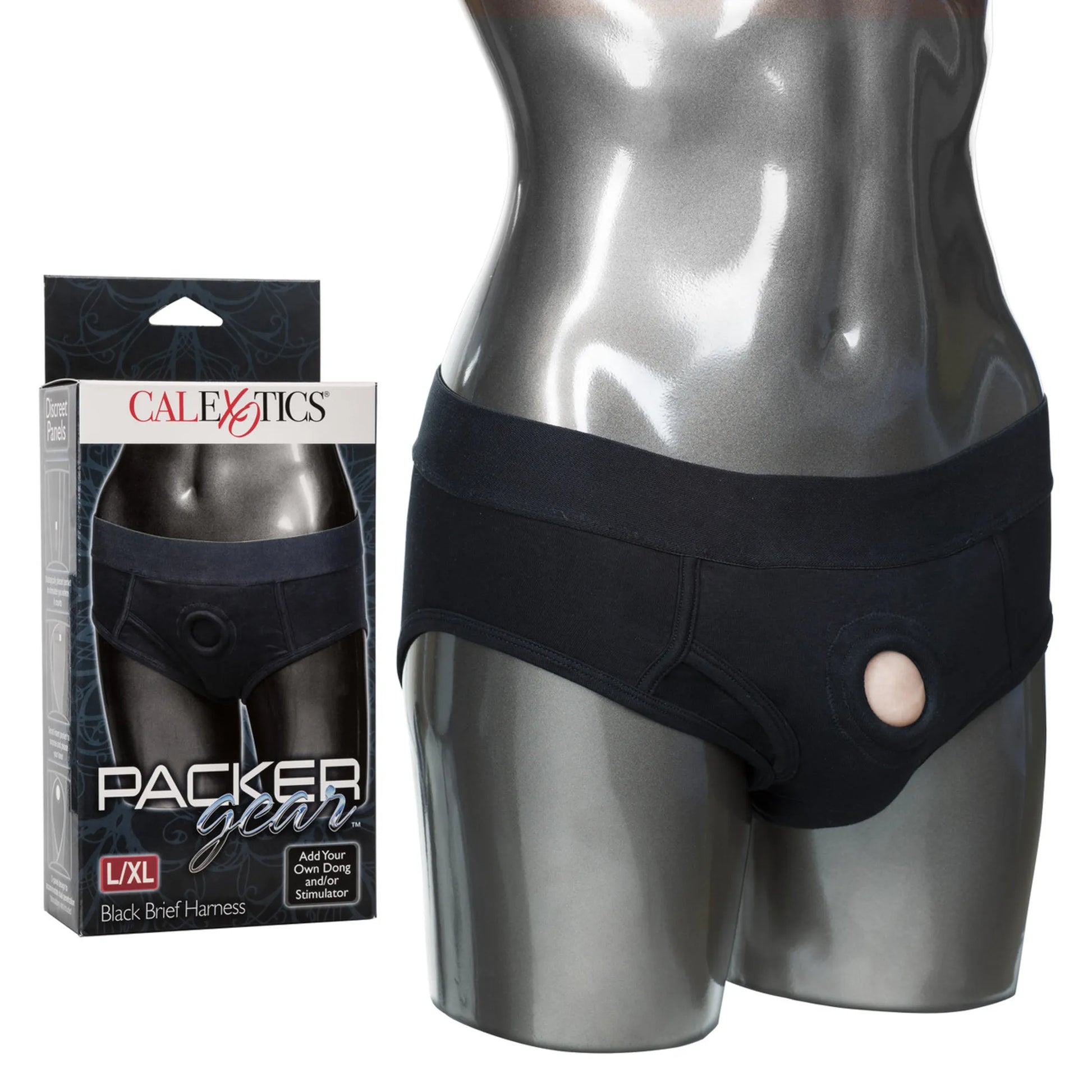 Packer Gear Black Brief Harness L/XL from California Exotic Novelties. The soft and comfortable Packer Gear Black Brief Harness is designed for easy wear and ultimate penetration satisfaction. The hipster cut panty has a fashionable masculine style and internal pockets to store your favorite vibrating stimulator. For one on one erotic action, slip on the Briefs and insert a power packed Dong. The washable Packer Gear Black Brief Harness is made from soft, stretchy and comfortable Cotton, Spandex and has an extra wide waistband for full support. The ultra soft lining features internal pockets and an internal strap that secures your Packer firmly in place. The reinforced 2 panel design also has a stretchy O-Ring that easily accommodates most sizes of tantalizing packers, dongs or probes. For your comfort and pleasure, these discreet Brief Harness offer exceptional support of any other toys during stimulation. The comfort fit Packer Gear Black Brief Harness has no adjustable straps or buckles. The easy wear Briefs slip on like underwear and fit like a glove. To experience orgasmic partner penetration pleasure all you have to do is select your favorite pleasuring tool. Insert a bullet shaped vibrating stimulator into the internal pocket and enjoy double the ecstasy. Discreet 2 panel design to accommodate dual penetration. Reinforced O-ring stretches to accommodate most Packers, Dongs or Probes. Soft, stretchy and comfortable. Comfortable soft lining. Internal strap to secure your packer in place. Packer not included. Internal pockets to add a favorite stimulator, not included. Washable. 95% Cotton, 5% Spandex. Bulk Weight: 3.1 ounces. Categories: Packer Gear, Bondage, Fetish, Kink, Women's Underwear, Naughty Role Play, Strap-Ons, Harnesses, Sex Toys for Couples, Women, Body Harnesses. 2023.