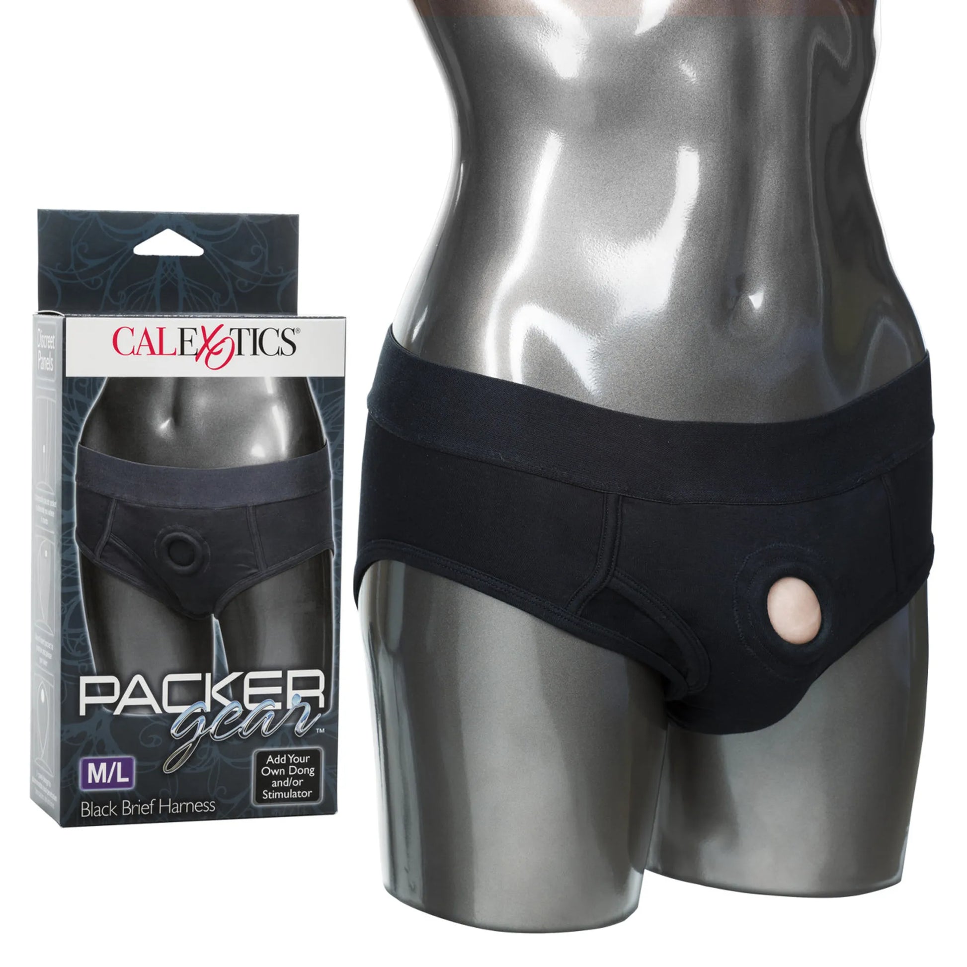 Packer Gear Black Brief Harness M/L from California Exotic Novelties. The soft and comfortable Packer Gear Black Brief Harness is designed for easy wear and ultimate penetration satisfaction. The hipster cut panty has a fashionable masculine style and internal pockets to store your favorite vibrating stimulator. For one on one erotic action, slip on the Briefs and insert a power packed Dong. The washable Packer Gear Black Brief Harness is made from soft, stretchy and comfortable Cotton, Spandex and has an extra wide waistband for full support. The ultra soft lining features internal pockets and an internal strap that secures your packer firmly in place. The reinforced 2 panel design also has a stretchy O-Ring that easily accommodates most sizes of tantalizing packers, dongs or probes. For your comfort and pleasure, these discreet Brief Harness offer exceptional support of any other toys during stimulation. The comfort fit Packer Gear Black Brief Harness has no adjustable strapsorbuckles. The easy wear Briefs slip on like underwear and fit like a glove. To experience orgasmic partner penetration pleasure all you have to do is select your favorite pleasuring tool. Insert a bullet shaped vibrating stimulator into the internal pocket and enjoy double the ecstasy. Discreet 2 panel design to accommodate dual penetration. Reinforced O-ring stretches to accommodate most Packers, Dongs or Probes. Soft, stretchy and comfortable. Comfortable soft lining. Internal strap to secure your Packer in place. Packer not included. Internal pockets to add a favorite stimulator, not included. Washable. 95% Cotton, 5% Spandex. Bulk Weight: 3.6 ounces. Categories: Packer Gear, Bondage, Fetish, Kink, Women's Underwear, Naughty Role Play, Strap-Ons, Harnesses, Sex Toys for Couples, Women, Body Harnesses. 2023.