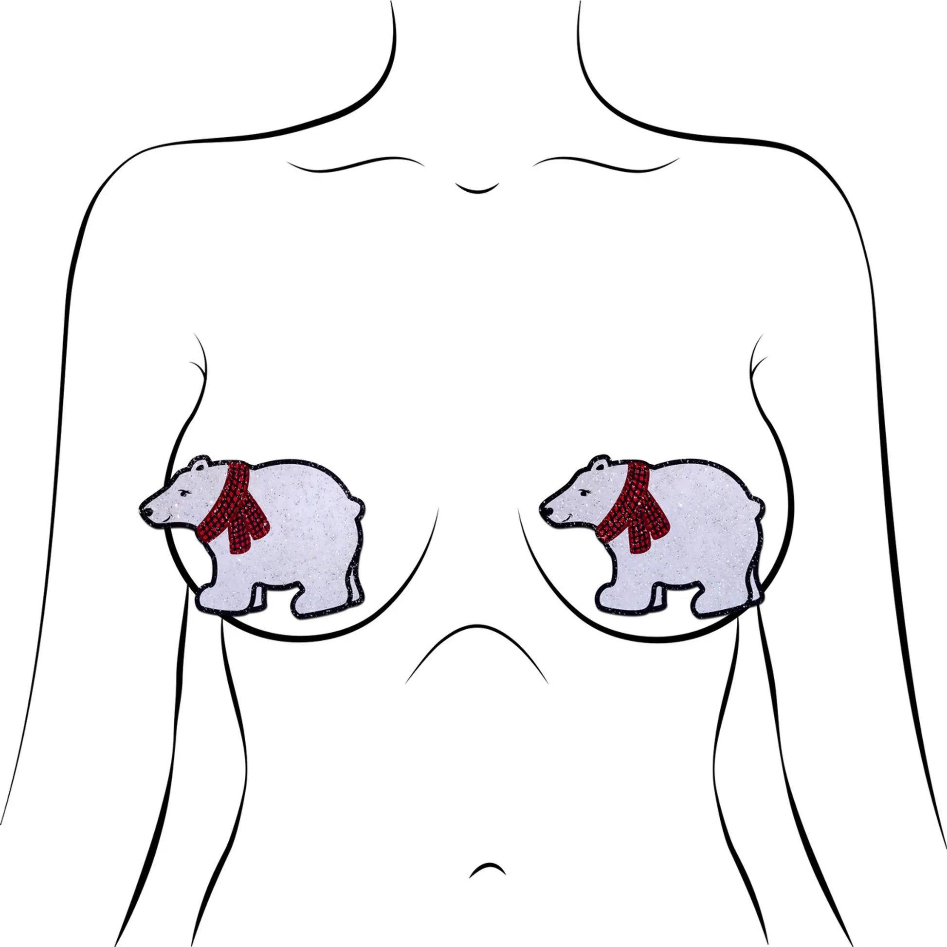 Pastease Brand Polar Bear with Scarf pasties. Polar Bear with Scarf Sparkling Nipple Pasties by Pastease. Hand made in the USA of soft form fitting material that forms seamlessly to curves and resists wrinkling over hardening nipples. Easy to apply. Just peel and stick on clean, dry skin. All Pastease Brand Pasties feature latex free, medical grade, waterproof adhesive that stay securely in place for as long as you like and until they are gently removed. Conceal or reveal with Pastease nipple pasties when worn with a sexy outfit, daring bikini, sheer top, revealing dress, Hefty bag, body lotion, crazy costume, party theme or nothing at all! Dimensions 3.8 inches by 2.8 inches. Coverage diameter 2.2 inches. Pastease Brand Pasties are the fun maker that brings out your inner Tease! All Pastease products are hand made, so the finished product you receive may vary slightly from the posted image. Go get your sexy fun freedom on! XOXO Pastease. New primary image package. Categories: Lingerie, Clothing, Sexy Costume Accessories, Xmas items, Pasties and Accessories. Restricted, Amazon Restricted. 2024.