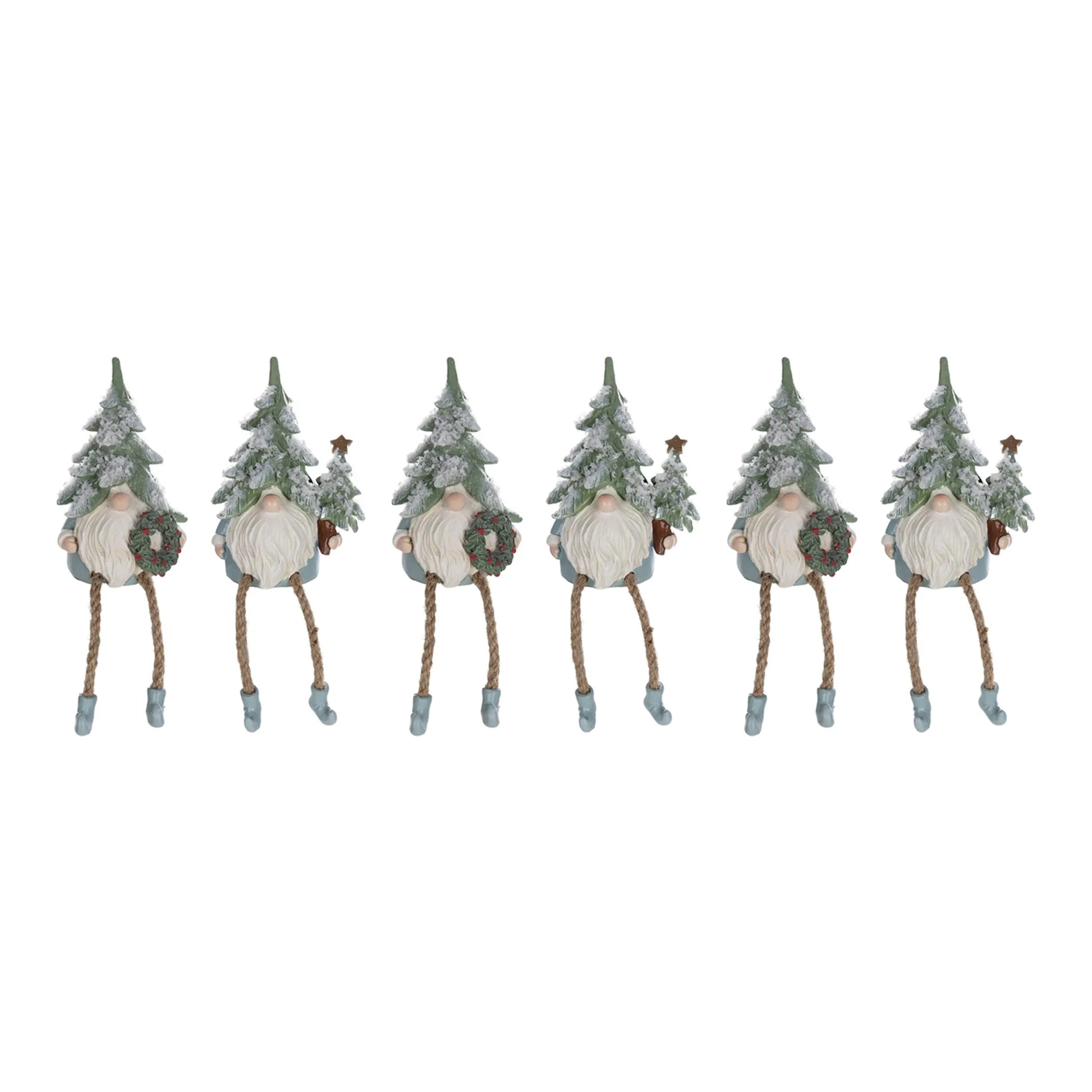 Ring in the holiday season with these adorable set of six Pine Tree Gnome Figurines! Crafted from polyresin and frosted for a winter-inspired finish, the set is adorned with delightful Christmas tree and wreath accents in cool green and blue tones. With a unique pine tree hat and dangle leg designs, these charming gnomes will bring holiday spirit to any home. Add some extra cheer this season with the set of Pine Tree Gnome Shelf Sitters!