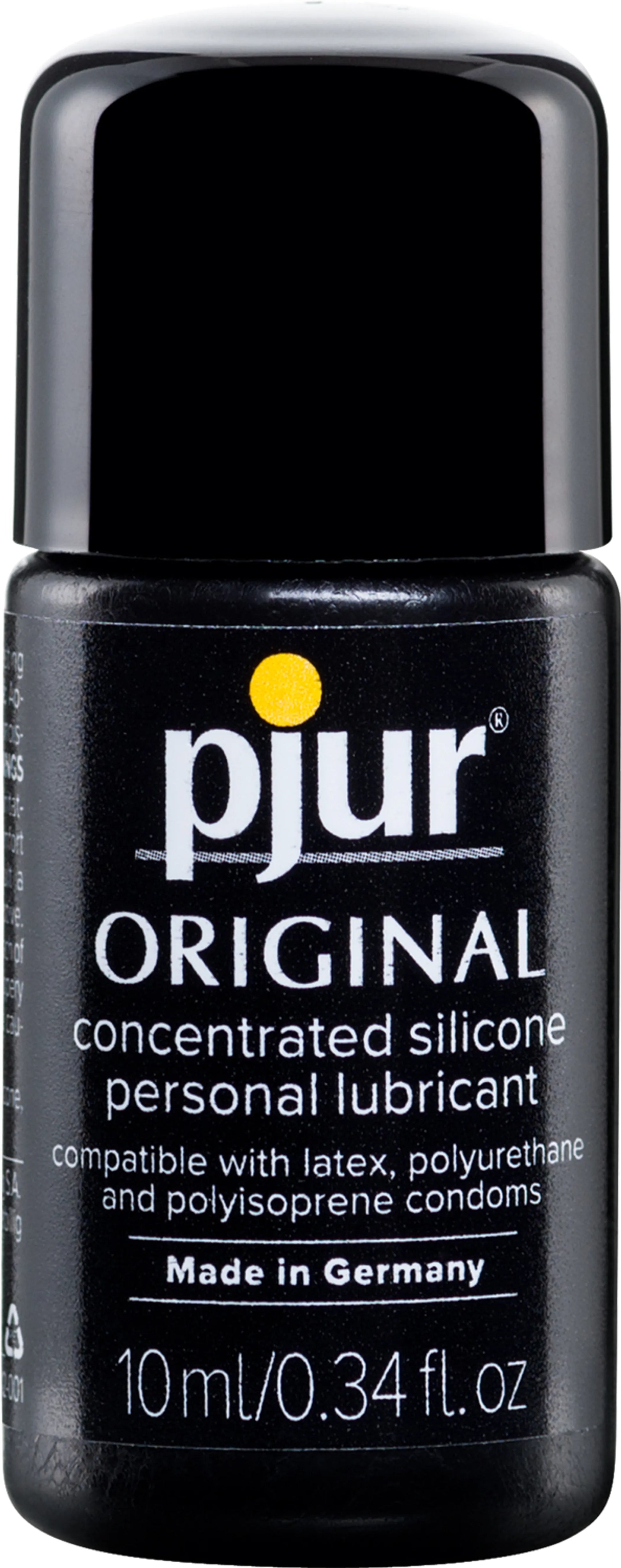 Pjur Original 10ml, .34 ounce bottle is a great travel size personal lubricant. Pjur Original Bodyglide provides extra long lasting lubrication for massage. Pjur Original concentrated Silicone personal lubricant is compatible with latex, polyurethane, and polyisoprene condoms. Original provides ultra long lasting personal lubrication. Enhances the comfort and pleasure of intimacy. May also be used for massage and skin conditioning. Only a few drops are needed. Never gets sticky or dries out. Leaves your skin soft and smooth. Non-irritating for the vaginal mucous skin. Does not block pores. Product is not made with fats, fragrances, paraben, preservatives or water. Neutral taste and odor. Directions for use: apply to any area of the body where you desire extra moisture. Replace cap after use. Safe for daily use. Store at room temperature. Ingredients: Cyclopentasiloxane, Dimethicone, Dimethiconol. Warnings and precautions: do not use on irritated or infected skin. If irritation or discomfort develops, discontinue use and consult a healthcare professional. Product is not a contraceptive and contains no spermicide. Keep out of the reach of children. Avoid contact with eyes. Very slippery on surfaces so clean spills immediately and use special caution in bath and shower areas. Pjur personal lubricants meet the quality standards of US health authorities. Features only a few drops needed. Guaranteed long lasting. Never sticky or tacky. Latex condom safe. No messy clean up. Leaves skin soft and silky. Made in Germany. Categories: Erotic Lotions, Lubricants, Personal Lubricants, Silicone Based Lubricants, Anal Lubes, Lotions, Sprays, Creams. Made in Germany. Restricted, Amazon Restricted. 2022.