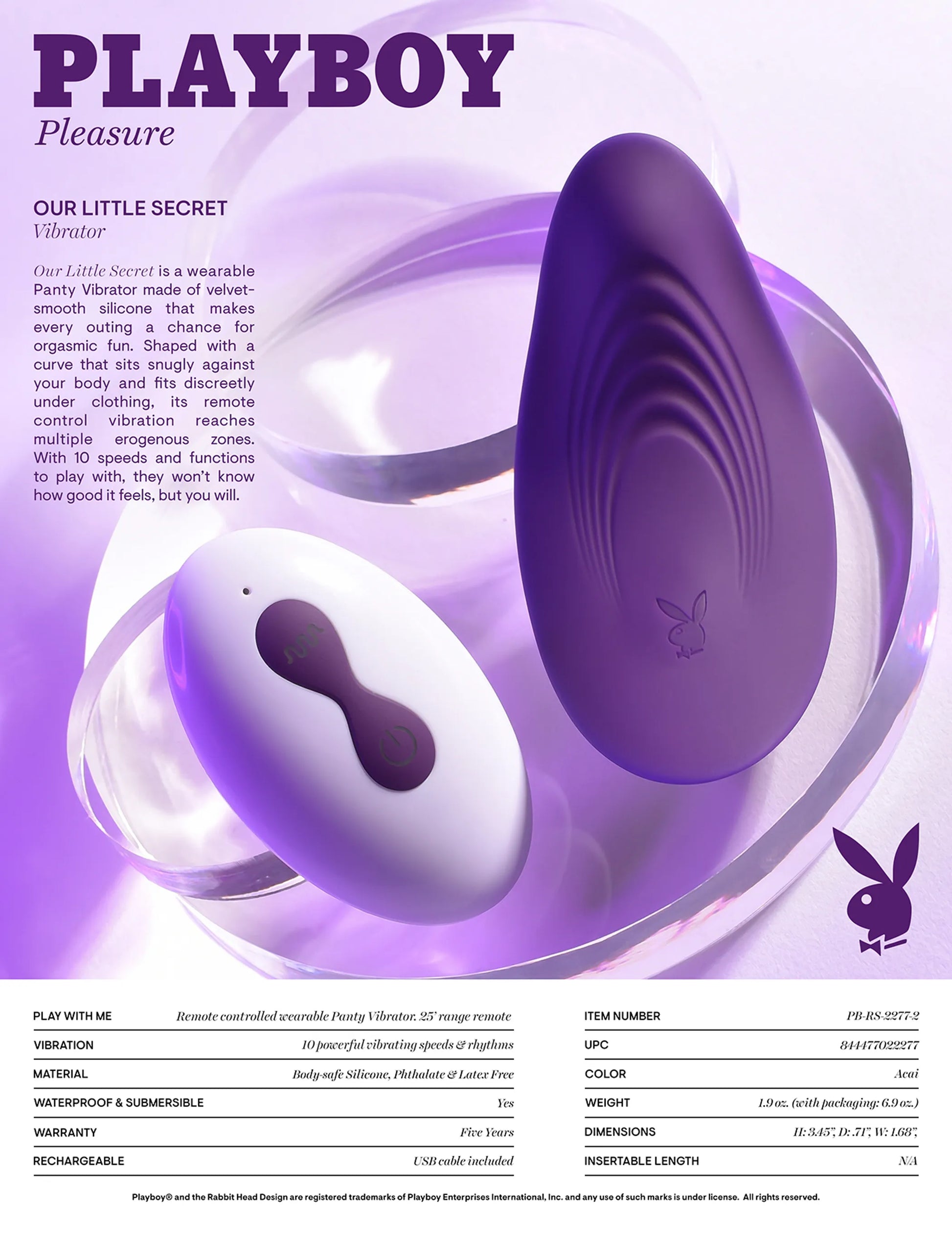 Playboy Our Little Secret Panty Vibrator from Evolved Novelties. The freedom to play is yours with Playboy Pleasure. Our Little Secret is a wearable Panty Vibrator made of velvet smooth Silicone that makes every outing a chance for orgasmic fun. Shaped with a flexible curve that sits snugly against your body and fits discreetly under clothing, its remote control vibration reaches multiple erogenous zones. With 10 low noise speeds and functions to play with, they will not know how good it feels, but you will. Features: Remote Controlled Wearable Panty Vibrator. Materials: Body safe Silicone, Phthalate free, Latex free. Size height 3.45 inches, depth .71 inch, width 1.68 inches. Insertion length 2 inches, diameter 1.68 inches. 10 vibrating speeds and rhythms. Press power button on vibrator for 3 seconds to turn on/off. USB Rechargeable. 60 minutes battery life._x005F_x000D_Charge time 90 minutes. Remote Control included. 25 feet range. Remote control uses 1 CR2032 battery. Vibrator is waterproof for play outside the bedroom. Submersible for easy cleaning and water play. 5 years manufacturer's warranty. Clean before and after use. Rinse with warm water. Pat dry before storing. Only use a water based personal lubricant. Please note panties are not included. Categories: Vibrators, Clitoral Stimulators, Rechargeable Vibrators, Sex Toys for Women, Clit Cuddlers, Vibrating Underwear. Play with me. Playboy and Rabbit Head design are registered trademarks of Playboy International. All rights reserved. 2023.