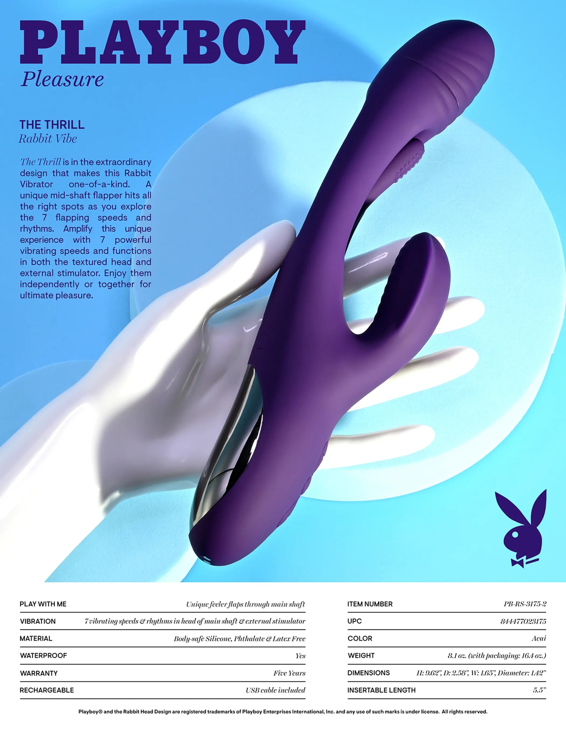 Playboy Pleasure The Thrill Rabbit Vibe The Freedom to Play from Evolved Novelties. Freedom to Play: the Thrill is in the extraordinary design that makes this Rabbit Vibrator one of a kind. A unique mid-shaft flapper hits all the right spots as you explore the 7 flapping speeds and rhythms. Amplify this unique experience with 7 powerful vibrating speeds and functions in both the textured head and external stimulator. Enjoy them independently or together for ultimate pleasure. Play with me Rabbit Vibrator key feature: unique feeler flaps through main shaft. Vibration: 7 vibrating speeds and rhythms in head of main shaft and external stimulator. Materials made using body safe Silicone that is both phthalates free and latex free. Waterproof vibrations. Five years warranty. Rechargeable via USB port, cable included. USB cord comes with a magnetic contact charger. The 2 round connection. Size specifications: size height 9.62 inches, depth 2.58 inches. Width 1.65 inches. Diameter 1.42 inches. Insertable length 5.5 inches. Bulk weight 8.1 ounces, with packaging 16.4 ounces. Care instructions: clean product with an adult toy cleaner or soap and warm water before and after each use. Store this product in a clean, dry space preferably in a bag or box. Not touching other sex toys. Please note that oil based personal lubricants can corrode toys materials. Please recycle contains Lithium.Li-Ion must be recycled. Categories: Vibrators, Rechargeable Vibrators, Sex Toys for Women, G-Spot Rabbit Style Vibrators. 2023 Catalog.