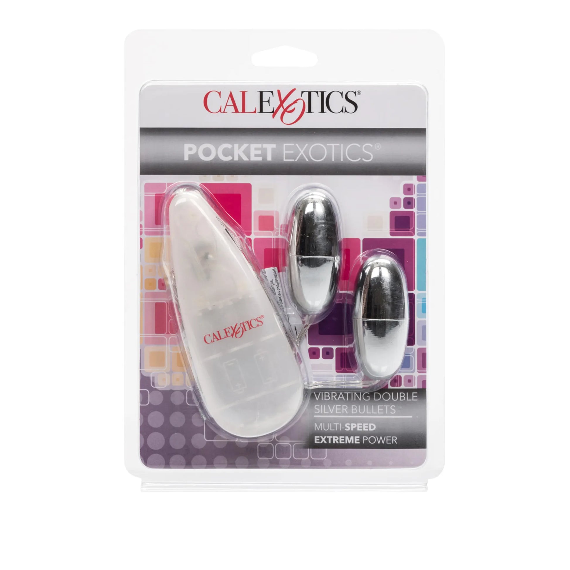 Pocket Exotic Double Bullet Vibrator Silver from California Exotic Novelties. You will find a silver shine of pleasure glowing when you enjoy with these multi-speed vibrating bullets. The Pocket Exotics Vibrating Double Silver Bullets are made from ABS Plastic with Silver plating, making them safe, sensual and stimulating all in one shiny Silver package. If you crave vibrating bullets that offer smooth, sexy pleasure, then you have struck a vein of pure silver. These sensual Bullet Vibrators have everything you need to get what you want: the ultimate in sensual pleasure. The super satisfying stimulating Dual Silver Bullets offer shimmering multi-speed satisfaction in a smooth and sensual shape. Durable and thrilling, the pleasure is powerful with our high quality, Double Silver Bullet Vibrators. You will find the peak of pleasure and new levels of satisfaction, whether you enjoy these glittery Silver Bullets on your own or with a partner. Let these bullets aim for the heart of desire, and enjoy a truly exciting sensual adventure that really shines. For a bedroom experience that is utterly satiating these vibrating bullets just will not miss. Our stimulating dual silver bullets aim for pure pleasure and satiation. Double Sliver Bullet Vibrators are a versatile, compact, powerful and pocket sized! Multiple speed bullet vibrator. Safe and pure for body and pleasure. Made using phthalate free, non-toxic materials ABS Plastic with Silver Plating Bullets, ABS Plastic with Polypropylene PP Cote Power Controller. Two multiple speed vibrating Plastic Silver Bullets connected to the same power supply. Vibrating sex toy requires 2 AA batteries, not included. Do not leave batteries in the vibrator between uses. Bullet vibrator measures 2.1 inches long by 1 inch. Bulk weight: 3.5 ounces. Bullet vibrators can be used to stimulate the clitoris, nipples, anus. Sex toy can also be used in conjunction with Kegel exercise routines. Always clean before and after use plus between partners. 1 year warranty. Category: For Women Bullet, Beads, Balls, Bullets. Pocket Exotics Vibrating Double Silver Bullets is a registered trademark for California Exotic Novelties. Sex toys and sexual wellness. Categories: Bullets, Eggs, Sex Toys for Women, Men, Couples, Vibrating Bullets, Eggs, Dual Vibrating Bullets and Eggs, Kegel Balls. 2023.