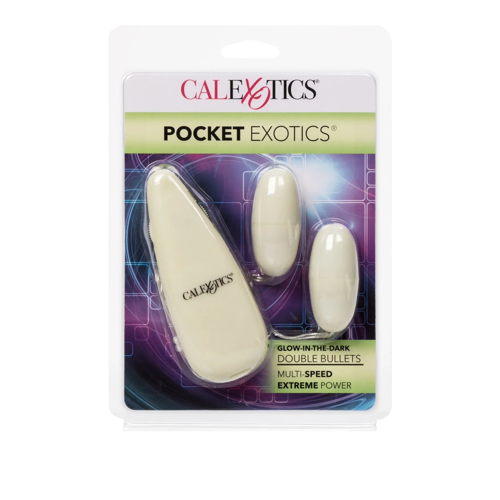 Pocket Exotics Glows In The Dark Double Bullet Vibrators from California Exotic Novelties. What sensations will you find in the dark? Discover new heights of pleasure with our Glow in the Dark Pocket Exotics Vibrating Glowing Double Bullet. In this soft sensual light you will illuminate thrilling moments with our multi-speed, glow in the dark stimulator, pocket sized, so you can glow, go and easily get thoroughly gratified. For the ultimate glow, all you have to do is expose our bullets to any light source, and you will achieve the maximum sexy soft shine. Let the glow last as you reach the peak of your sensual adventure. It is just as safe as it is thrilling. Designed for the best in bedroom pleasure, this vibrating glowing double bullet vibrators offers high quality, sturdy, and sensual fun. Let our stimulating double bullet vibrators light your way to sweet satiation, whether you?EUR(TM)re enjoying solo or with your partner. Glow In The Dark Pocket Exotics Vibrating Double Bullets are versatile compact powerful stimulators. Pocket sized vibrating bullets that glows in the dark. Safe and pure for body and pleasure. Made using phthalate free, non-toxic materials: ABS Plastic with a Polypropylene PP Cote. Vibrators measure 2.1 inches long by 1 inch wide. Bulk weight 3.5 ounces. Vibrating sex toy requires 2 AA batteries, not included. Do not leave batteries in the vibrator between uses. Always clean before and after use plus between partners. 1 year warranty. Category: For Women, Bullet, Beads and Balls, Bullets. Glow In The Dark Pocket Exotics Vibrating Double Bullets is a registered trademark for California Exotic Novelties. Sex toys and sexual wellness. Categories: Vibrators, Bullets, Eggs, Sex Toys for Women, Men, Couples, Vibrating Bullets and Eggs. 2023.