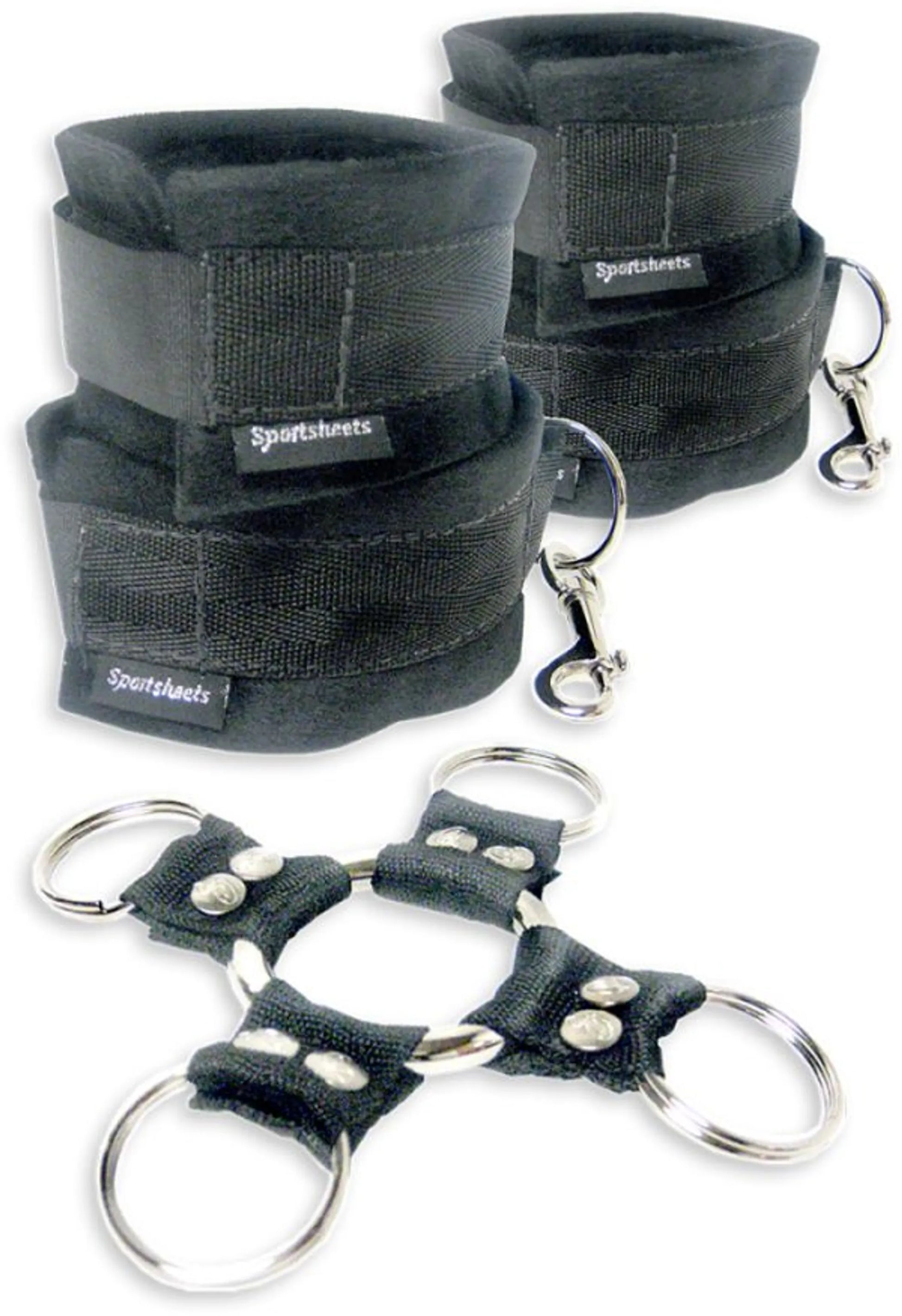 5 Piece Hog Tie and Cuffs Set from Sporsheets. A timeless bondage classic. Four adjustable cuffs clip around a heavy duty metal o-ring. Comfortable cuffs adjust for easy on and easy off with Velcro closures. Sportsheets the classic bondage position. 5 Piece Hog Tie Set is a best seller for many reasons, first it works. Hardly any assembly required. Easy to use, comfortable to wear There is no better way to restrain your partner! Outstanding adult fun. 4 adjustable cuffs wrap comfortably around the wrists and ankles. Hooks easily attach to the center ring for a quick and easy way to secure your partner. No bondage experience required to use this device the 5 piece hog tie set! Category: Restraint, Roleplay, Restraint Play. Classic bondage restraint works great as a sex position device. Details: what can your partner do to you when your hands are tied to your legs behind your back? Anything they want. Specifications: four adjustable cuffs with Velcro closures, connect to a heavy duty metal O-ring or can be clipped together for limitless positions. Sturdy yet easy to remove, this kit creates quick and easy ways to restrain your partner. Includes: 4 soft, sturdy cuffs with easy on, easy off Velcro closures, 1 metal ring connector. Materials: Polypropylene webbing, nylon webbing, nickel free hardware, Velboa fabric, Velcro. The 5 Piece Hog Tie & Cuff Set can be used in the front or behind the back depending on the type of sex play you wish to have. Sturdy yet easy to remove, this product creates quick and easy ways to restrain your partner. Sportsheets keeping couples connected. Limited Lifetime Warranty, Sportsheets will replace any defective product. If the product is not available, Sportsheets will replace it with a similar product of similar function. Video. New images. 2021.