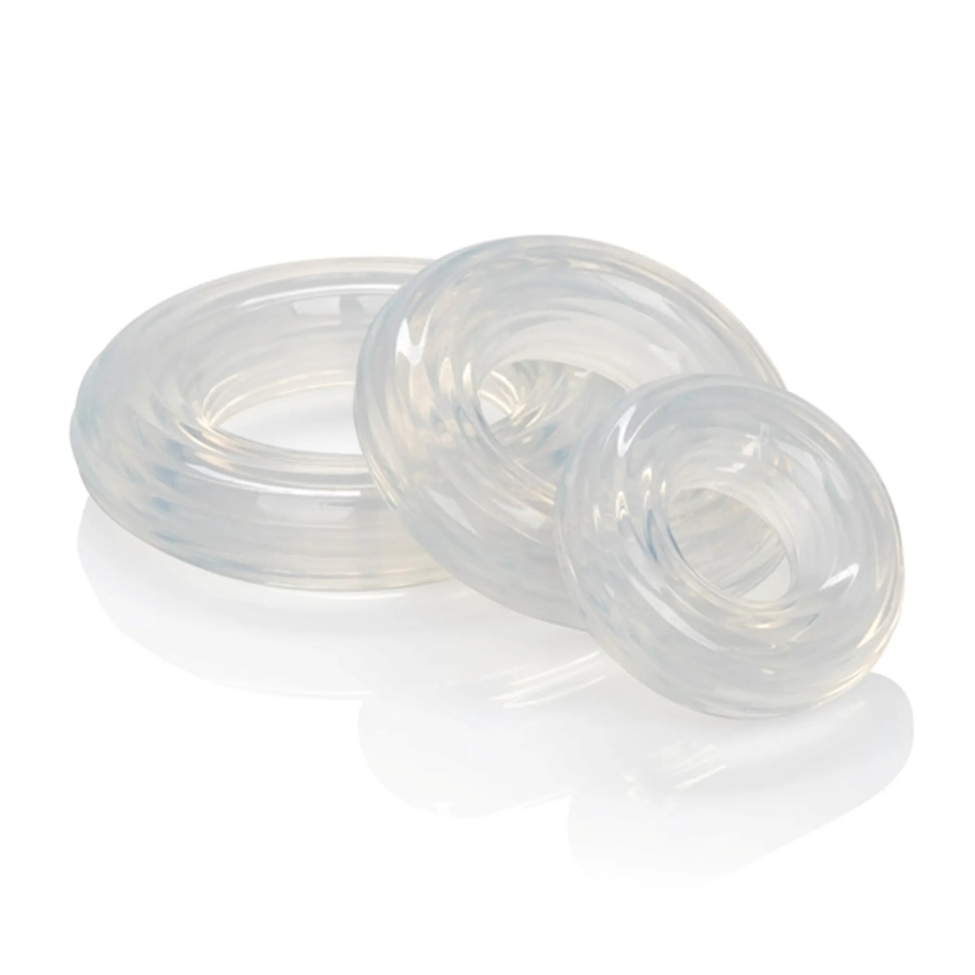 Premium Silicone Ring Set from California Exotic Novelties. Satisfy your lover?EUR(TM)s erotic demands with the versatile Premium Silicone Ring Set. The 3 piece Set comprises of Medium Ring, Large Ring and XL Ring sized Penis Rings designed for increased girth and stamina support during prolonged intimate pleasure. The Ring Set is made from soft and smooth, hygienically superior Silicone, for a comfortable fit and pleasurable wear. The transparent, super stretchy Rings are ultra thick, totally seamless and sensually contoured to ensure maximized satisfaction. Prepare to enjoy a peak performance that goes on and on. The durable and sturdy Rings offer endless possibilities to spice up your bedroom routine. Let your imagination run wild and explore fun and creative ways to wrap up your member. The easy to use enhancers are perfect for prolonged intimate encounters with your lover. To heighten sensitivity, always use a quality water based personal lubricant with these enhancement sex toys. Before and after use, clean the stretchy cock rings with a toy cleaner spray, or wash in mild soapy water. Ultra stretchy Silicone rings. Totally seamless. Thick and durable for versatile use. Provides girth and support. Soft and comfortable. Materials: Silicone. Bulk weight 2.6 ounces. .75 inch inner Ring diameter Medium. 1 inch inner Ring diameter Large. 1.25 inches inner ring diameter Ring XL. Categories: Bondage, Fetish, Kink, Love Rings, Cock Rings, Sensual Kits, Men's Cock and Ball Gear, Cock Ring Trios. 2023._x000D_