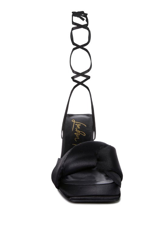 Stuffed Satin Knotted strap sandal with interesting triangle block heel in shiny Patent PU is a party charmer. The high lace-up block heel sandal looks gorgeous on the feet and will be your favorite casual sandal in no time.