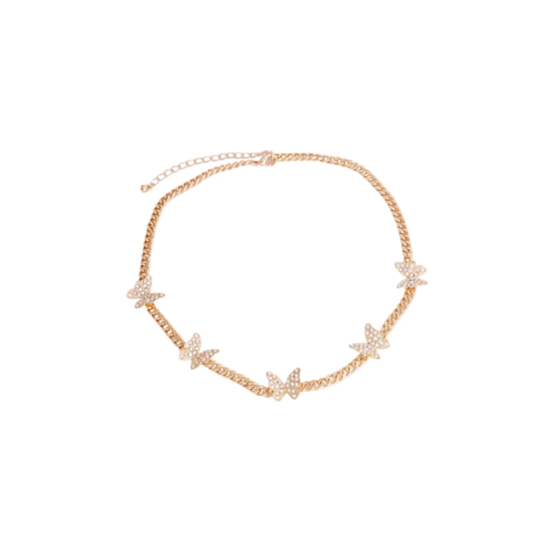 Perfect for Spring and Summer! Gold Metal Chain Necklace Featuring Rhinestone Butterfly Station Details. Butterflies measure .5 inches each.