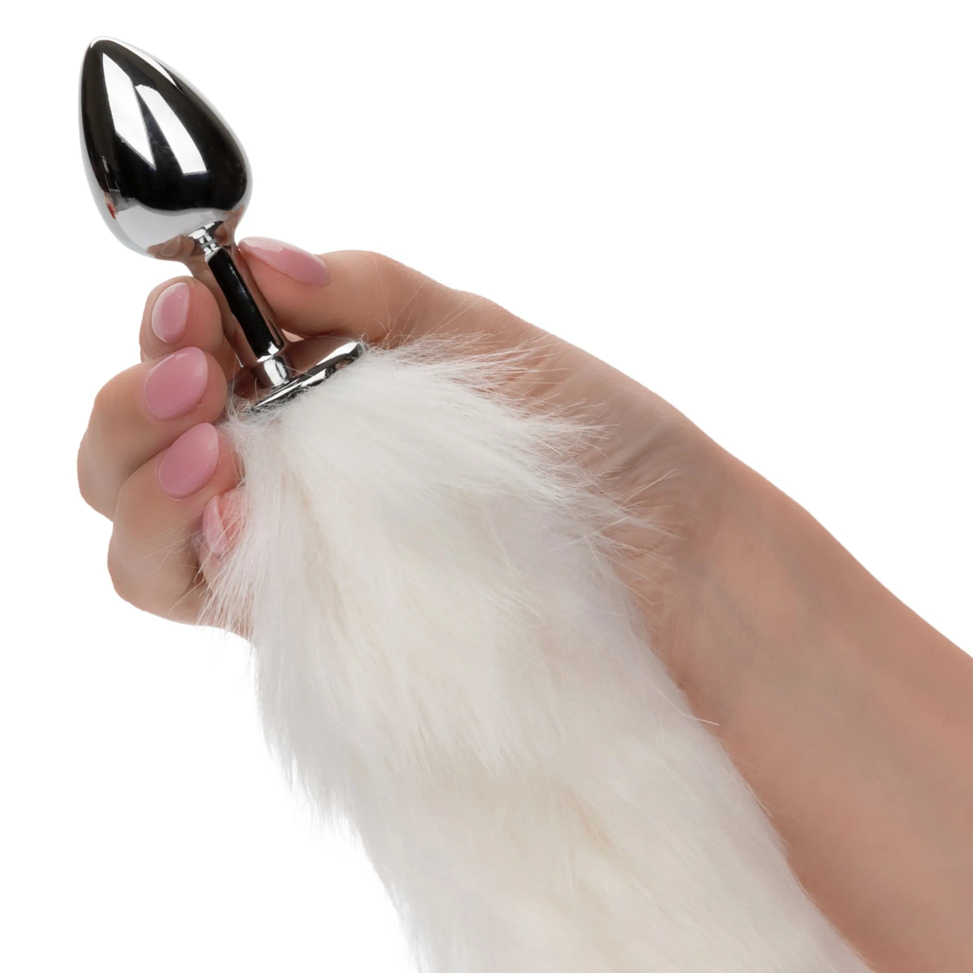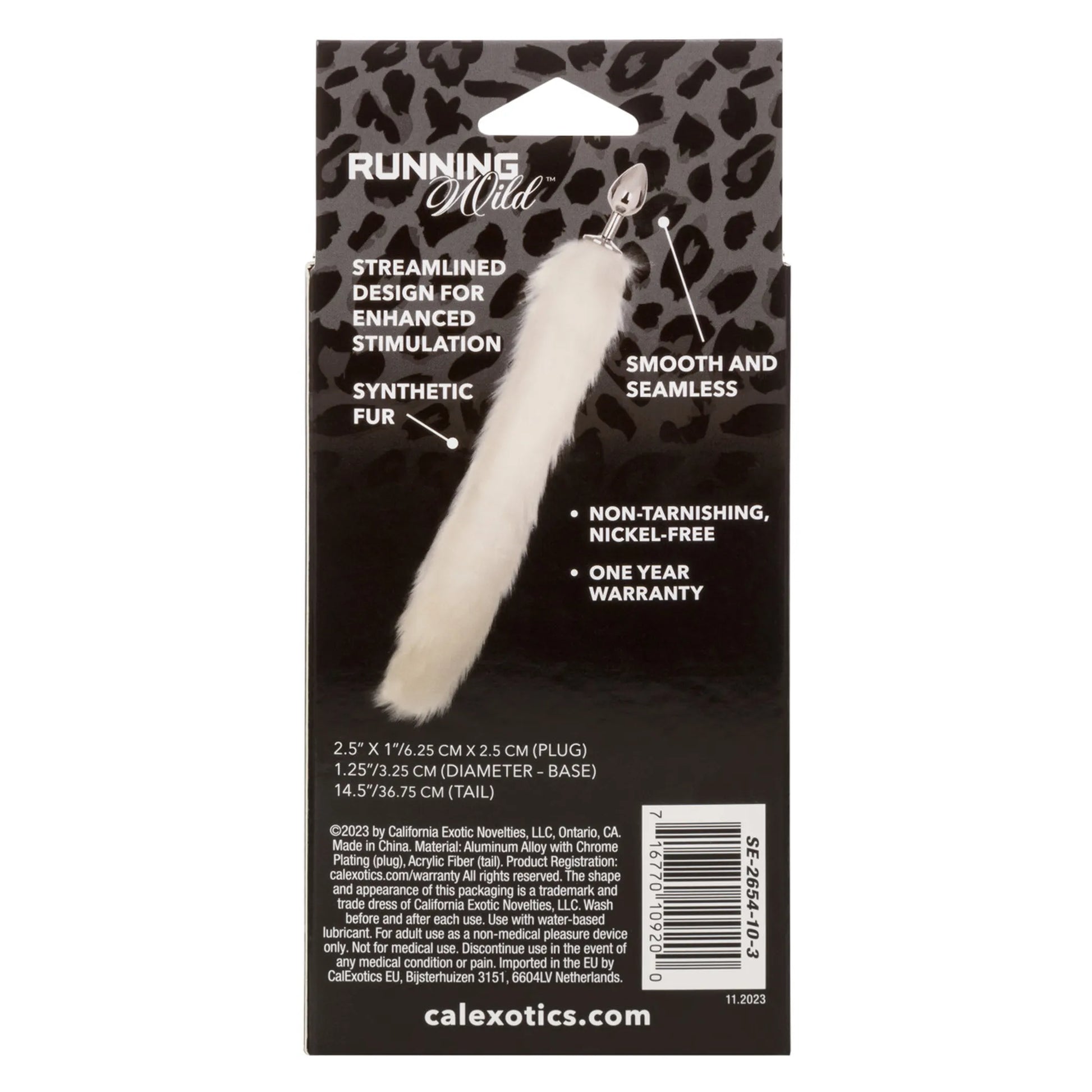 Running Wild White Tail Butt Plug from California Exotic Novelties. Explore exotic pleasure with the Running Wild Tail, a smooth, seamless metallic Anal Plug that comes with a luxurious long tail. This accessory combines the thrill of sensory exploration with the allure of the untamed, ideal for those seeking an adventurous twist in their intimate play. The Butt Plug's streamlined design is crafted for enhanced stimulation, with a smooth surface that glides effortlessly, providing a tantalizing experience. Its sleek form is perfect for both beginners and experienced users, offering a comfortable yet exhilarating journey into pleasure. Adorned with a synthetic fur tail, this anal probe adds a touch of exotic charm to your sensual play. Its non-tarnishing, Nickel free construction offers peace of mind along with pleasurable sensations. Elevate your sense of pleasure with the Running Wild Tail Butt Plug, an accessory designed to captivate your senses and unleash wild, uninhibited joy. Specifications: SKU SE-2654-10-3. Color: White. 1 Year Warranty. Features: Phthalate free. Material type: Aluminum Alloy with Chrome Plating Butt Plug, Acrylic Fiber Tail. Measurements: 2.5 inches by 1 inch Butt Plug. 1.25 inches diameter at base. 14.5 inches Tail. Bulk weight 2.7 ounces. Package 3.8 ounces. Package: 3.25 inches by 3.25 inches by 6.75 inches. Categories: Bondage, Fetish, Kink, Anal Toys, Small, Medium Butt Plugs, Sex Toys for Couples, Whips, Paddles, Ticklers. 2024.