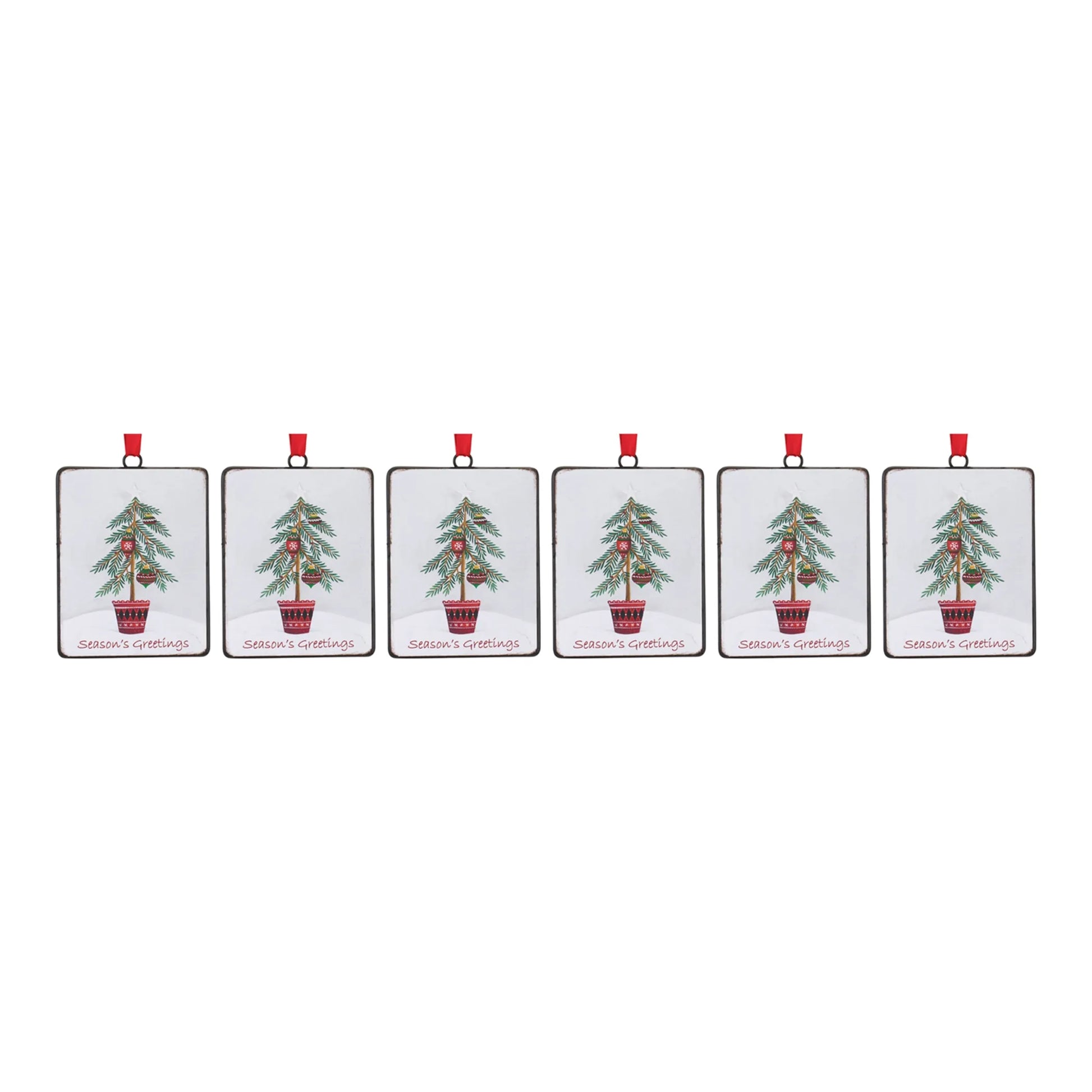 Adorn your Christmas tree with this beautiful set of Pine Tree Ornaments. Featuring the sentiment "Seasons Greetings", the festive red and green tones paired with the potted pine tree design and Nordic patterned accents is the perfect combination to create a memorable display. The quality iron metal composition with delicate ribbon tie hanger is sure to endure for seasons to come. Whether you're adding a touch of cheer to your home or gifting to a loved one, these ornaments will definitely bring smiles to your home.