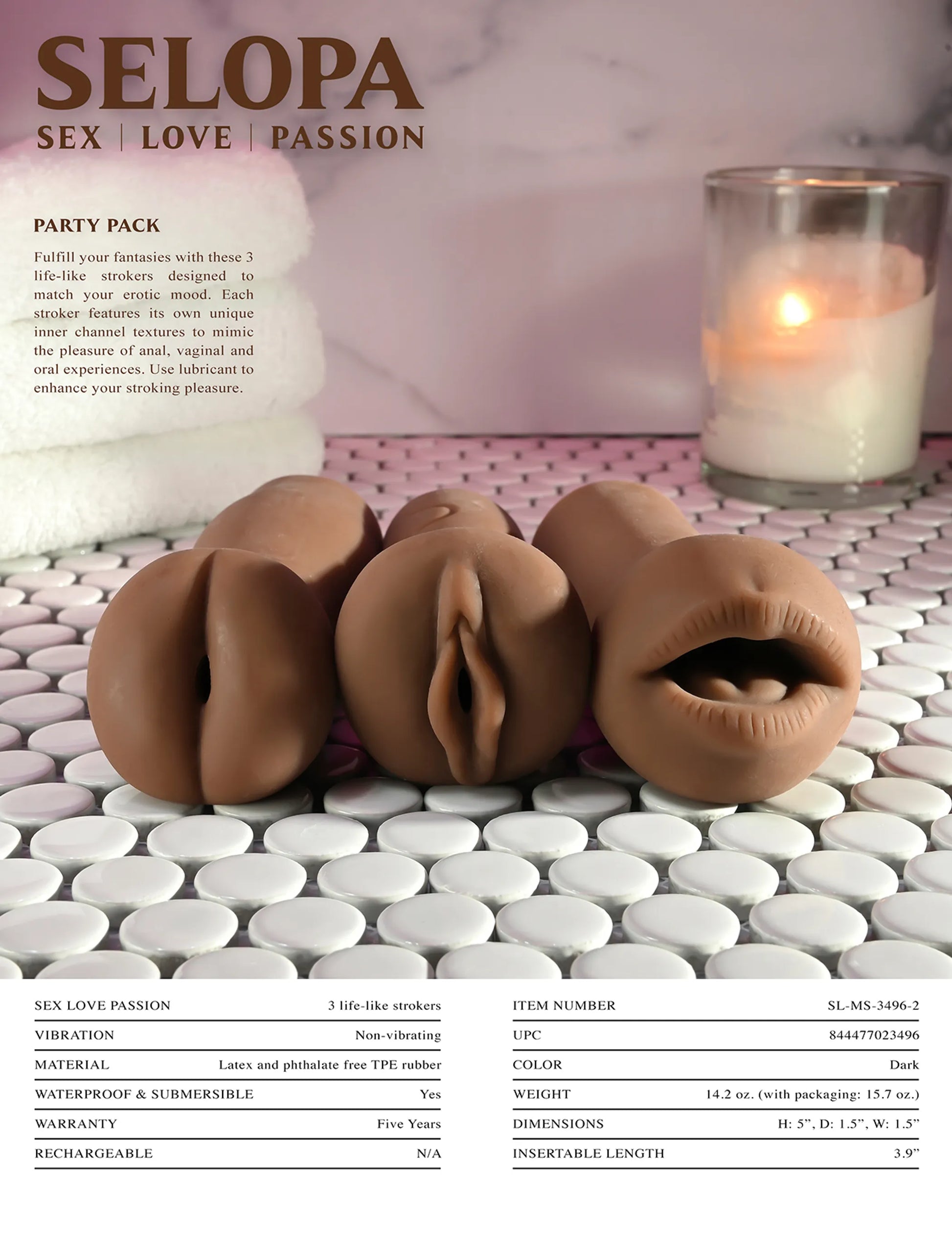 Selopa Party Pack Dark 3 different strokers from Evolved Novelties. Fulfill your fantasies with these 3 life like strokers designed to match your erotic mood. Each stroker features its own unique inner channel textures to mimic the pleasure of anal, vaginal and oral experiences. Use a water lubricant to enhance your stroking pleasure. Specifications: each stroker is 5 inches in length.Made from body safe latex and phthalate free Thermoplastic Elastomers TPE Rubber. Care instructions: clean products with toy cleaner before and after use. Pat dry before storing. Store this product in a clean dry place. Perfectably in a dry, clean box. No touching other toys. Please note that oil based lubricants can corrode toy materials. Categories: Masturbators, Masturbator Trios, Sex Toys for Men, Mouth Strokers, Pussy and Ass Strokers. 2024.