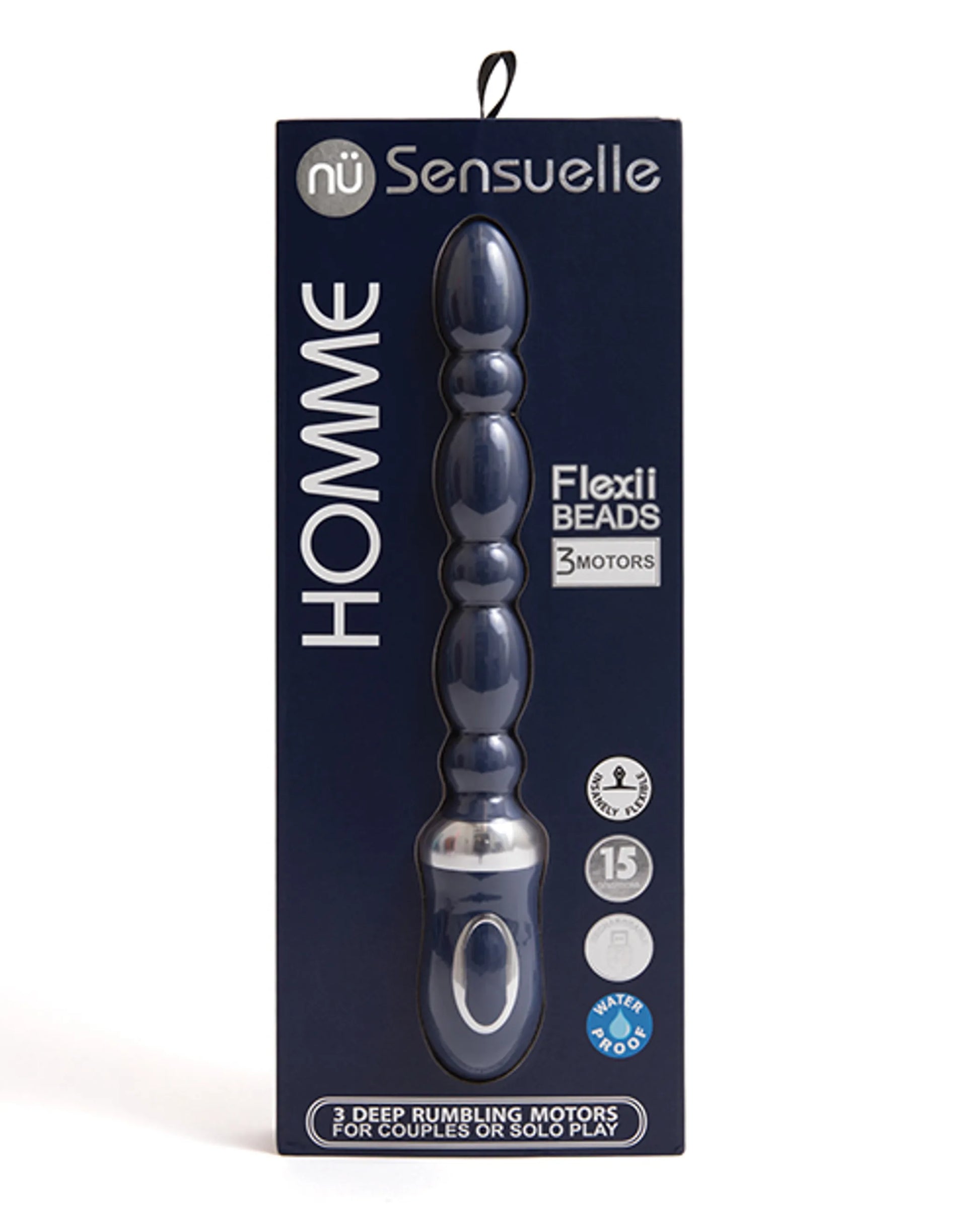 Sensuelle Homme Flexii Beads Navy Blue Vibrator from Nu Sensuelle. Three powerful motors ensure a continuous vibration that can be felt no matter the position or the erogenous zone. With 7 inches of insertion length and ultra flexible, the Flexii Beads are designed to follow the natural curves of your body making it perfect for G-Spot or anal stimulation. The ergonomic handle and intuitive controls are easy to adjust between 15 powerful intensities. Vibrator features 3 motors. 15 vibrations speeds and functions. For couples or solo play. Waterproof for play outside the bedroom. Discover your deepest sensual desires with the versatile Flexii Beads. Three powerful motors ensure a continuous vibration that can be felt no matter the position or the erogenous zone. With 7 inches of insertion length and ultra flexible, the Flexii Beads are designed to follow the natural curves of your body and the ergonomic handle and intuitive controls are easy to adjust between 15 powerful intensities. Features: 3 speeds and 12 vibration patterns. USB rechargeable. Body safe Silicone. Water submersible for wet play in the bath tub. Homme Flexii Beads specifications: Materials Body safe Silicone, ABS Plastic accents. Size: 1.10 inches by 11.02 inches. Bulk weight .210 of a pound. Speeds and Pulsations: 3 speeds + 12 pulsations._x000D_