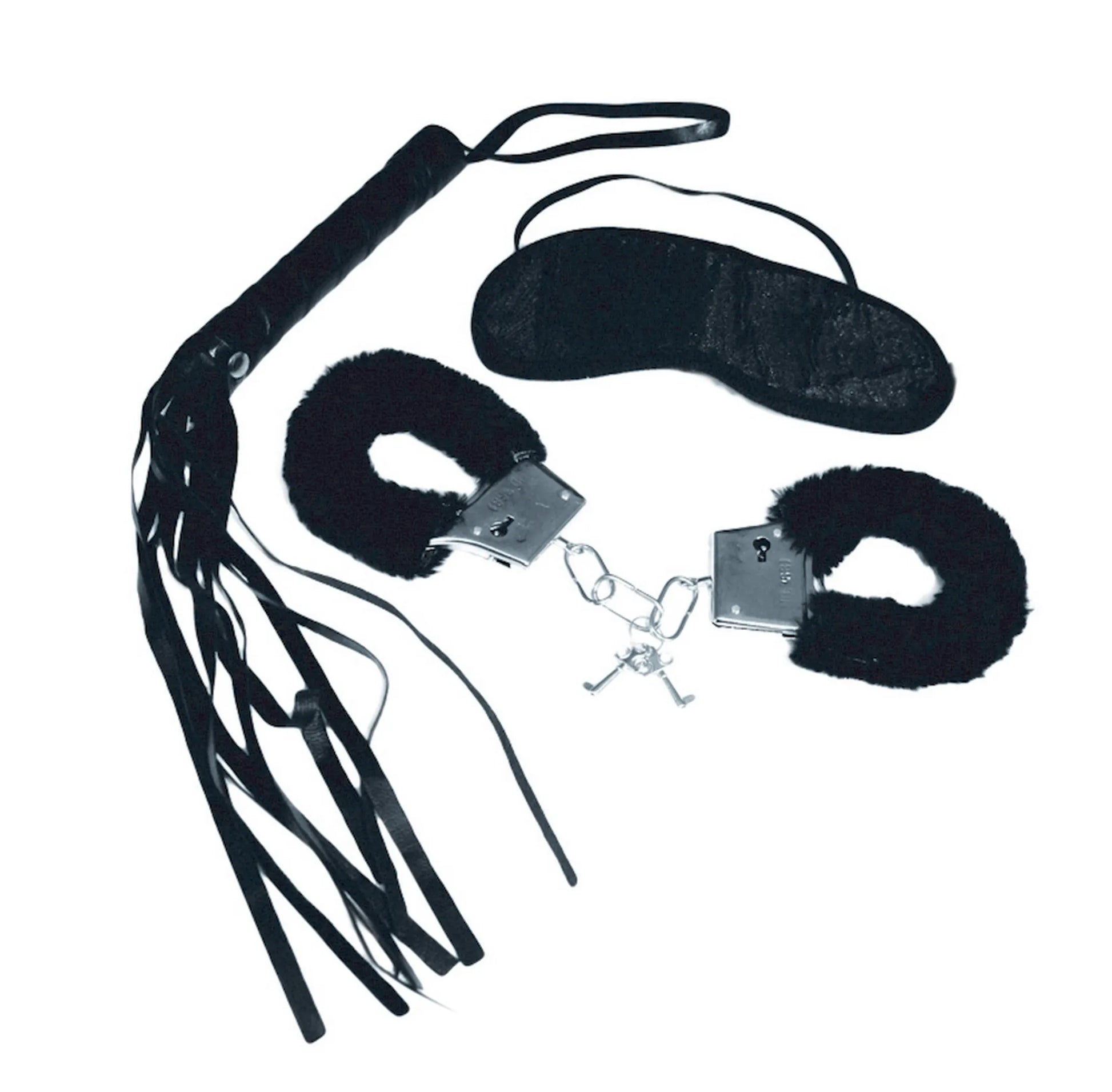 Sex and Mischief Intro To S&M Kit Black. Resistance is Futile. A handwritten note greeted me at the front door. My boyfriend is not much for leaving love letters, so I was both shocked and intrigued when I read the titillating instructions: On the table you will find a blindfold to confound the senses; a pair of furry cuffs to assure resistance would be futile, and a flogging whip to make sure the futility was permanent. Put on the cuffs and blindfold and deliver the whip to me in the bedroom. Follow the scent of jasmine. Quivering with excitement, I did as I was directed. Kit consists of three of most popular beginners bondage and kinky sex. One small whip, a set of fuzzy handcuffs with release keys and a one size fits most blindfold. All the essentials for a foray into uncharted territory. Have you and your lover been looking for a renewed sense of adventure, intimacy, and connection in the bedroom? This three piece set has everything you need to embark on an erotic excursion of power dynamics and trust. Furry cuffs give you control without too much wear and tear on untainted wrists. A blindfold provides an atmosphere of anticipation as your lover waits is suspense for your next move. Finally, a whip that is perfect for still-sensitive flesh gives you grounds to both pleasure and punish. Push the limits of your comfort zone and be rewarded with new heights of ecstasy! Sportsheets redefines S&M. Includes 1 pair black furry metal handcuffs, 1 black satin blindfold, 1 black whip 16 inches. Limited Lifetime Warranty, Sportsheets will replace any defective product. If the product is not available, Sportsheets will replace it with a similar product of similar function. Video. 2022.