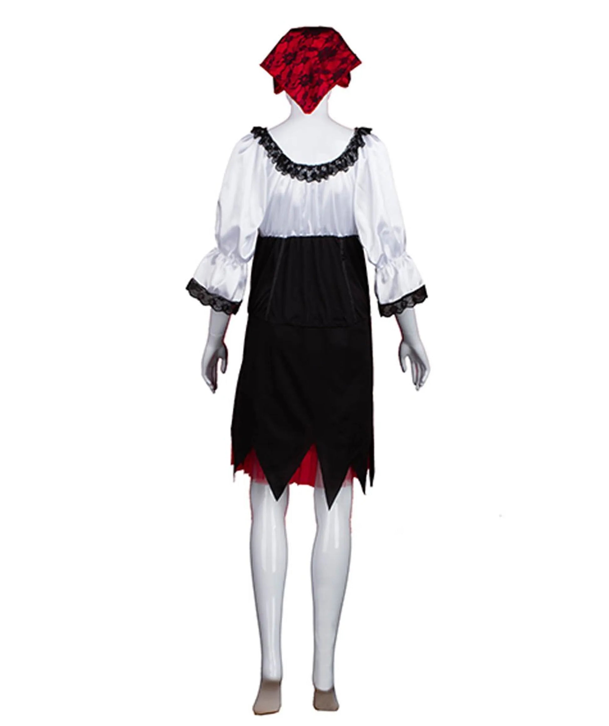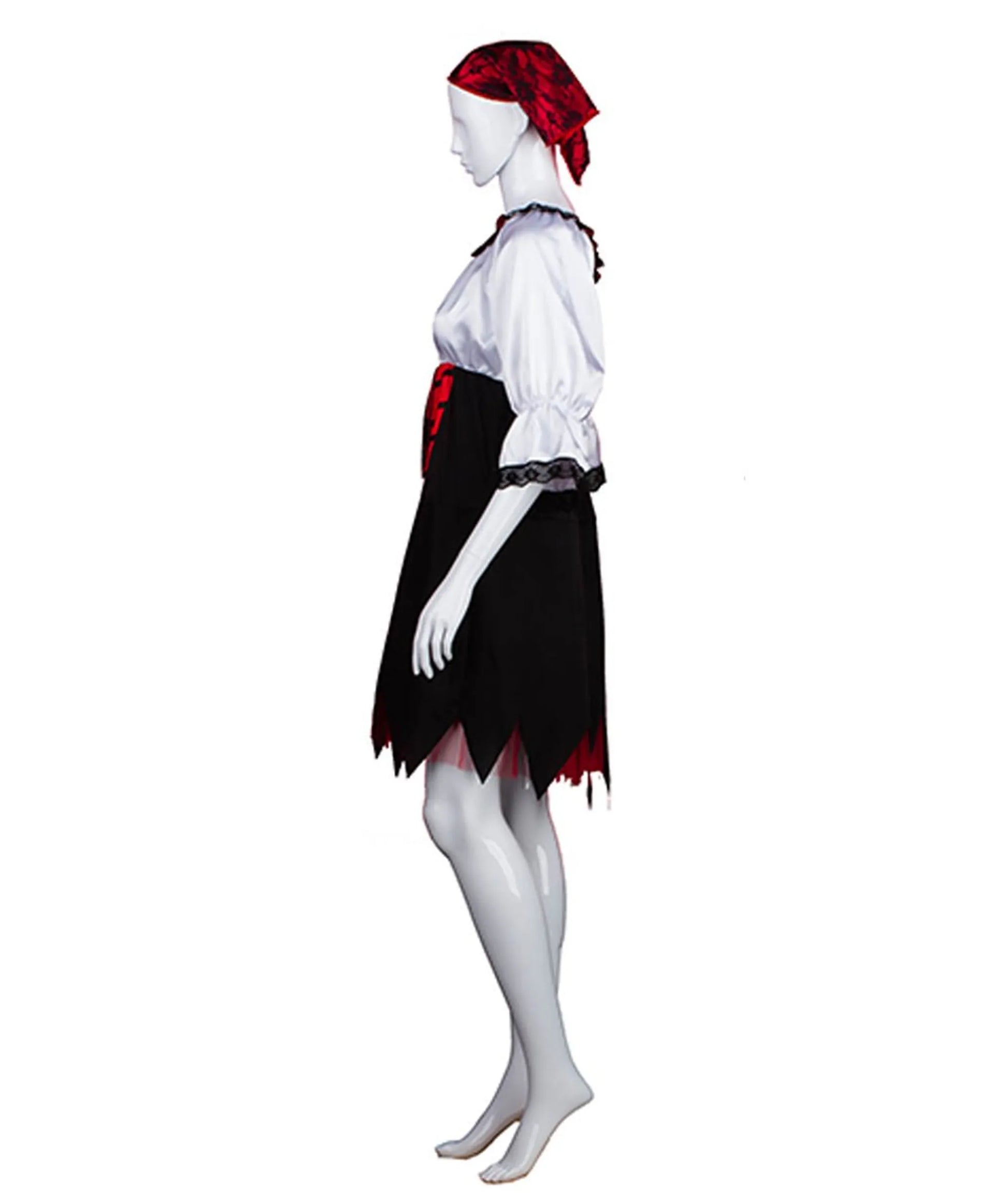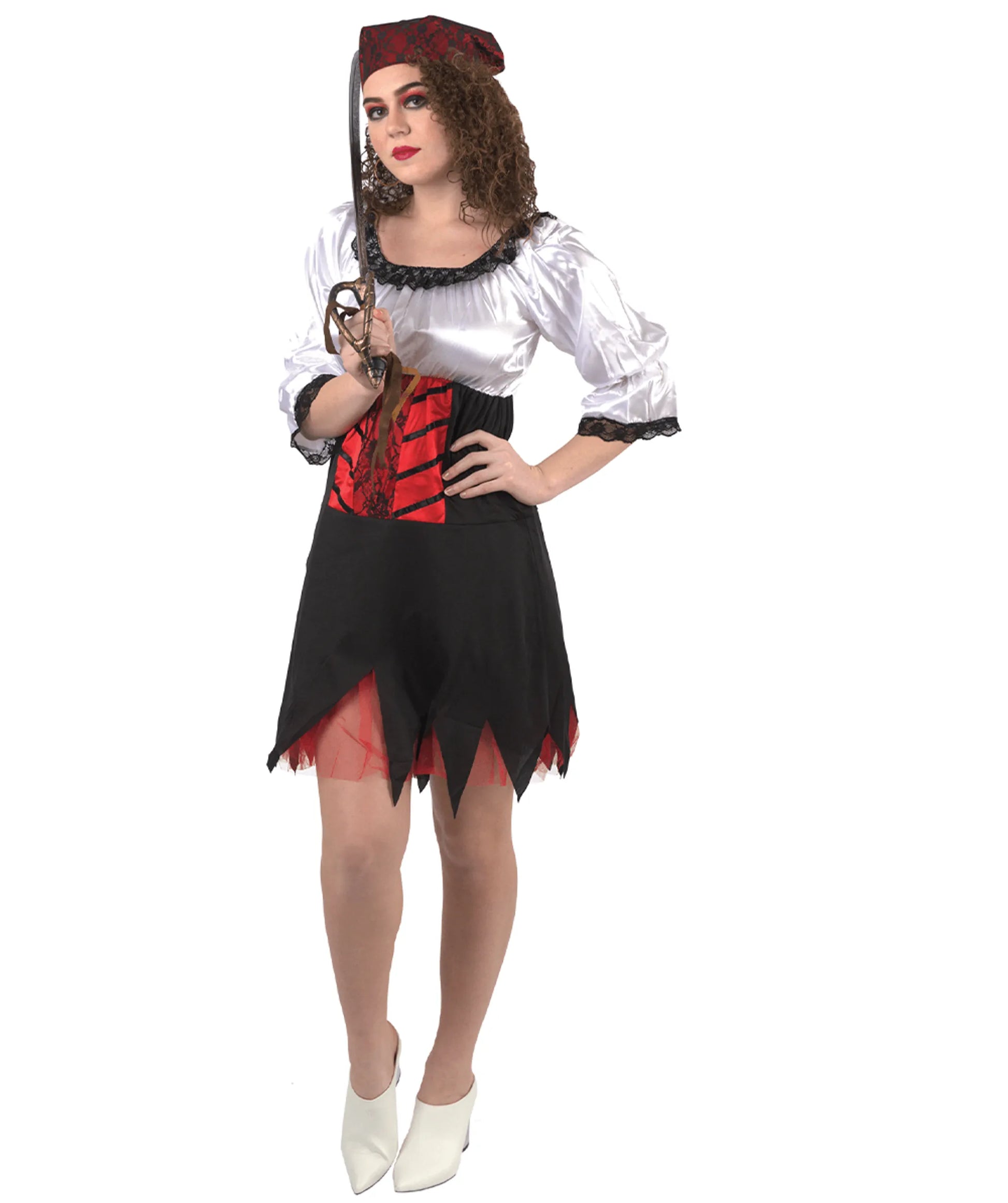 Women's Sexy Pirate Costume in size large. Made of 100% synthetic materials. Does not include wig. Hand wash with gentle soap and line dry.