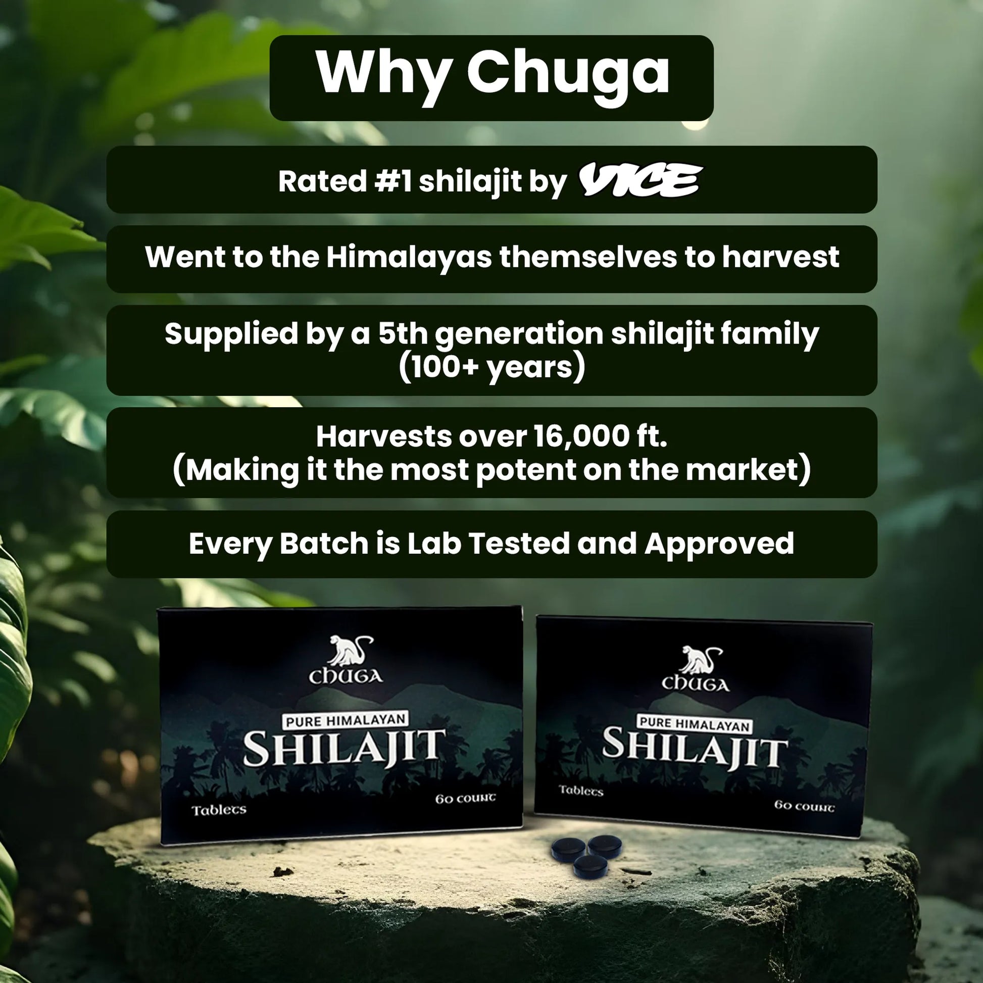 Premium Quality: Chuga's shilajit is harvested in India from the Himalayan mountain range. It is gathered at 16,000+ feet, making it Grade A shilajit. The fulvic and humic acid content within shilajit increases in relation to the height it is harvested from. This makes our shilajit extremely potent and nutrient dense compared to most shilajit that is harvested at 4,000-6,000 feet.