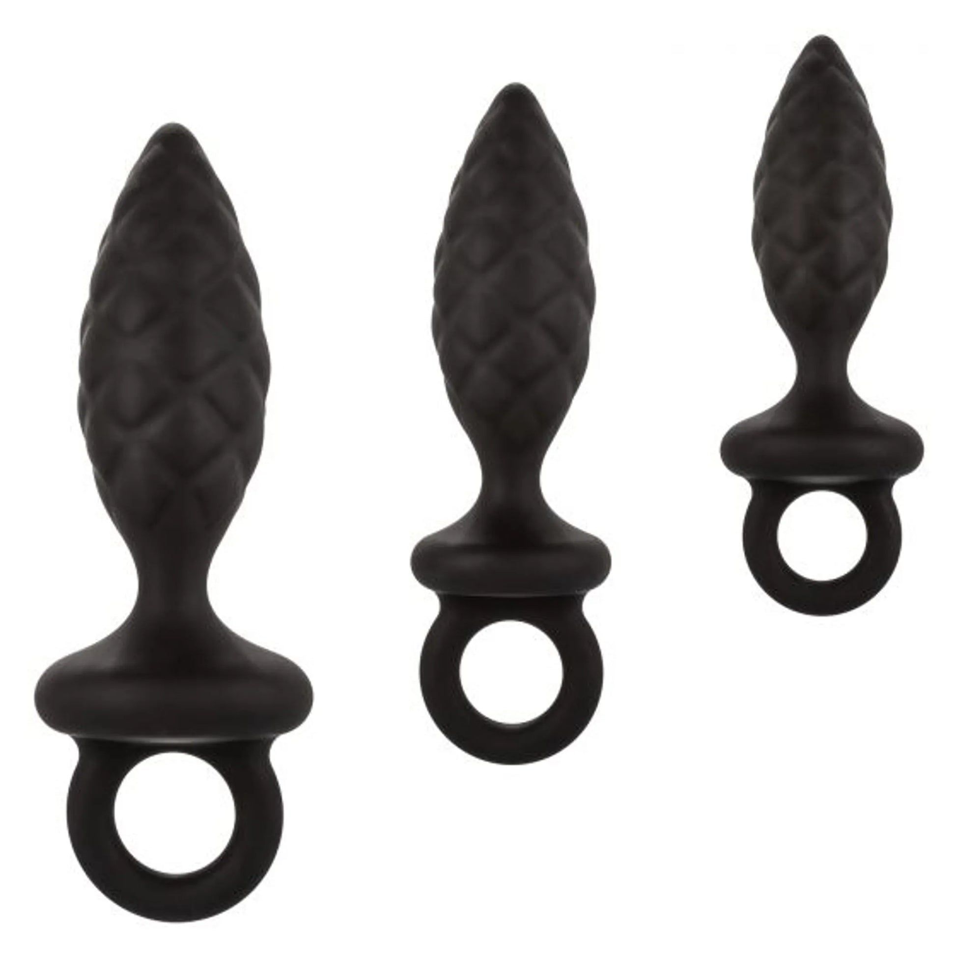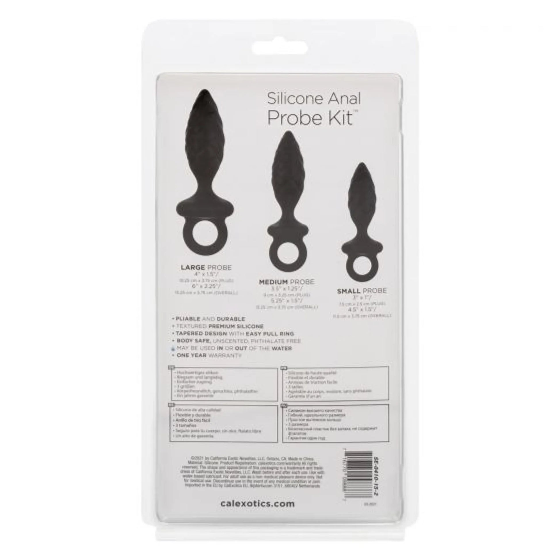 Silicone Anal Probe Kit from California Exotic Novelties. Open the door of thrilling anal sensation with the Silicone Anal Probe Kit. This thrilling anal training kit includes a set of 3 graduated Anal Plugs with easy pull ring and incredible textured surface. To enjoy everything the exhilarating world of anal play has to offer, training is in order to ensure total safety and satisfaction. Each probe in our kit gradually increases in length and girth for superb pleasure at any level of pleasure play. While each increase of your training expands your horizons, use the convenient easy pull ring for steamy stimulation, effortless insertion and gentle removal. The flexible probes are made from a rippling textured Silicone. This body safe material is unscented and phthalate free to keep your most sensitive spots happy and healthy. Specifications: Color Black. Materials Silicone. Features: Phthalate free, Waterproof, non-vibrating. Please only use a water based personal lubricant. Always clean before and after use, plus between partners. Pat dry before storing. Measurements: 4 inches by 1.5 inches Large Anal Probe, 3.5 inches by 1.25 inches Medium Anal Probe, 3 inches by 1 inch, Small Anal Probe. Bulk weight 8.1 ounces. Package 10.9 ounces. Package 2.14 inches by 5.65 inches by 10.5 inches. 1 year warranty. Categories for the Silicone Anal Probe Kit: Anal Toys, Sex Toys for Couples, Sensual Kits, Anal Trainer Kits, Small Anal Probes, Medium Anal Probes, Large Anal Probes. 2023.