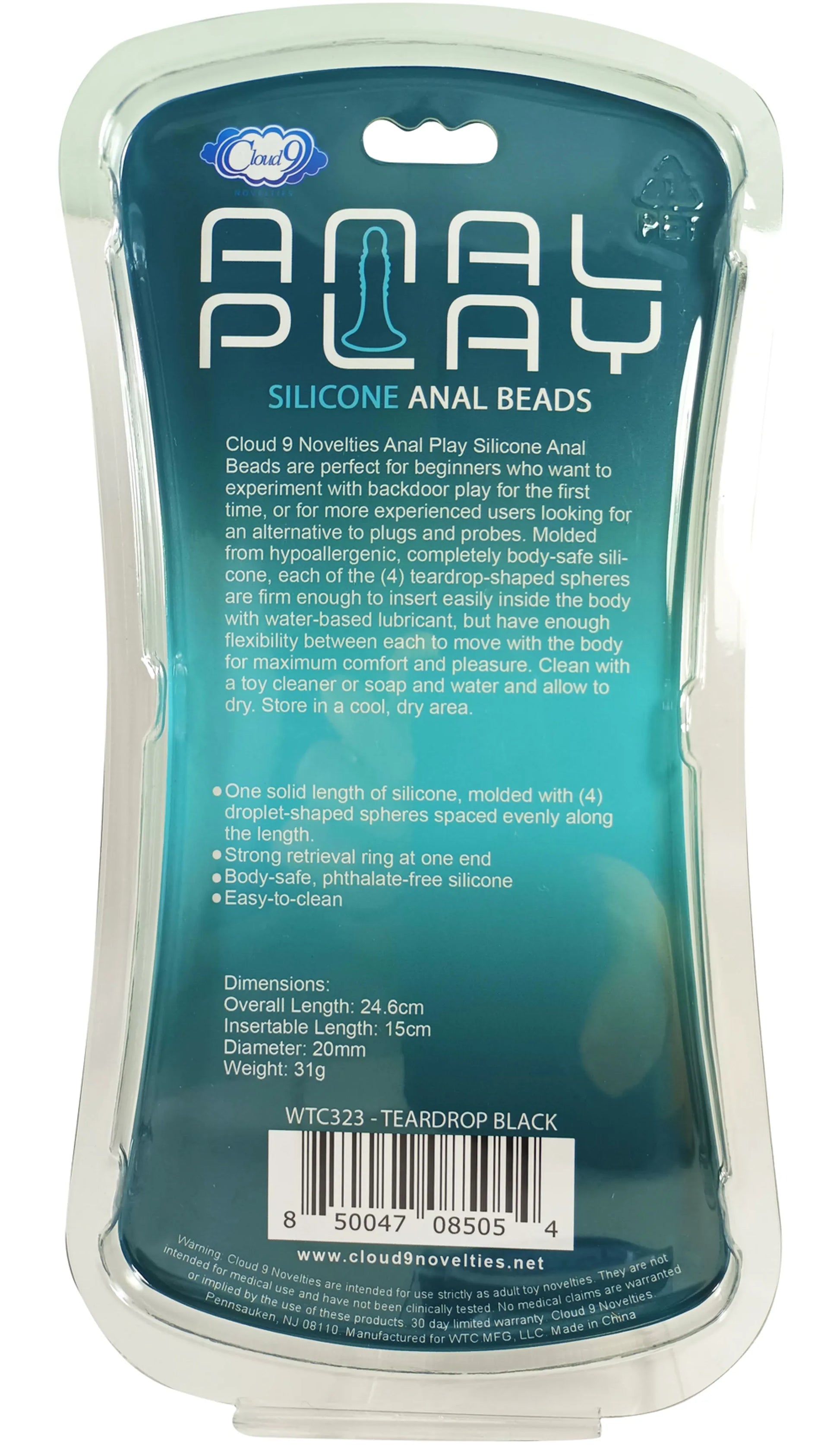 Silicone Anal Teardrop Small Black Plug from Cloud 9 Novelties. WTC323 Anal Play Silicone Anal Beads .78 inch Teardrop. Color - Black. UPC 850047085054. Cloud 9 Novelties Anal Play Silicone Anal Beads are perfect for beginners who want to experiment with back door play for the first time, or for more experienced users looking for an alternative to plugs and probes. Molded from hypoallergenic, completely body safe Silicone, each of the 4 teardrop shaped spheres are firm enough to insert easily inside the body with water based lubricant, but have enough flexibility between each to move with the body for maximum comfort and pleasure. Clean with a toy cleaner or soap and water and allow to dry. Store in a cool, dry area. Feautres: one solid length of Silicone, molded with 4 droplets shaped spheres spaced evenly along the length. Strong retrieval ring at one end. Body safe, phthalate free Silicone. Easy to clean. Dimensions: overall length 9.68 inches, insertion length 5.90 inches. Diameter 2.78 inch. Bulk weight 1.09 ounces. Categories: Anal Toys, Anal Beads, Probes, Sticks and Rods, Health and Beauty Aids, Sex Toys for Couples. Video. Restricted, Amazon Restricted. 2023.