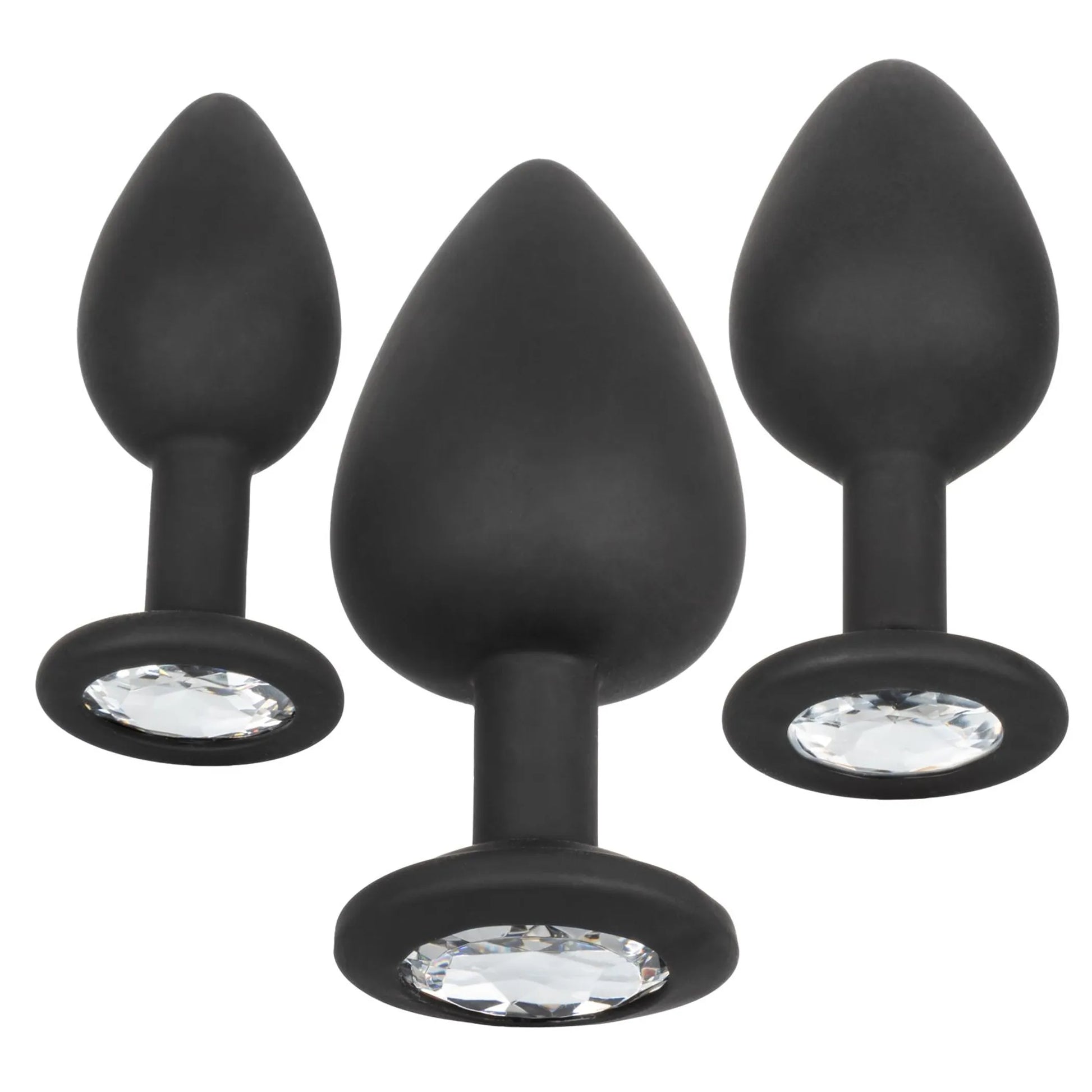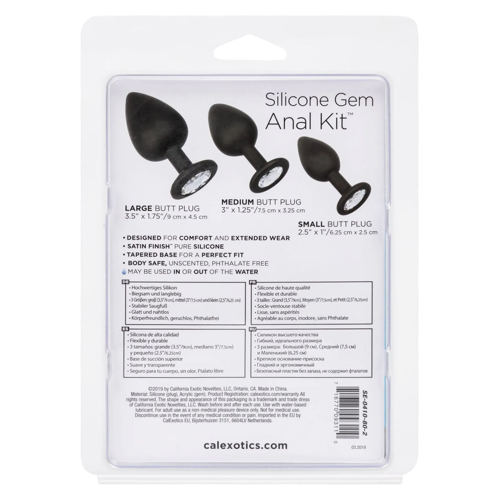 Silicone Gem Anal Kit Black from California Exotic Noveltiess. Open the door of thrilling anal sensation with the Silicone Gem Anal Exerciser Kit. This glamorous Anal Kit includes a set of 3 graduated Butt Plugs with a gem base to let you safely and comfortably increase passionate anal stimulation. To enjoy everything the exhilarating world of Anal Play has to offer, training is in order to ensure total safety and satisfaction. Each probe in our kit gradually increases in length and girth for superb pleasure at any level of pleasure play. While each increase of your training expands your horizons, use the sparkling Gem adorned base for steamy stimulation, effortless insertion and gentle removal. The flexible Probes are made from a smooth, seamless Satin Finish Silicone. This body safe material is unscented and phthalate free to keep your most sensitive spots happy and healthy. Specifications: color Black. Materials Silicone Butt Plugs, Acrylic Faux Diamond Gems. Features Phthalate free, Waterproof non-vibrating Butt Plugs. 1 year warranty. Measurements: Large Butt Plug 3.5 inches by 1.75 inches. Medium Butt Plug 3 inches by 1.25 inches. Small Butt Plug 2.5 inches by 1 inch. Bulk weight 9 ounces. Package 12 ounces. Package 2.25 inches by 6 inches by 8.5 inches. Always wash before and after use, plus between partners. Pat dry before storing. Only use a water based personal lubricant. For adults use only as a non-medical device. Categories for the Silicone Gem Anal Kit: Anal Toys, Sex Toys for Couples, Men, Women, Sensual Kits, Anal Trainer Kits, Holiday items. 2023.