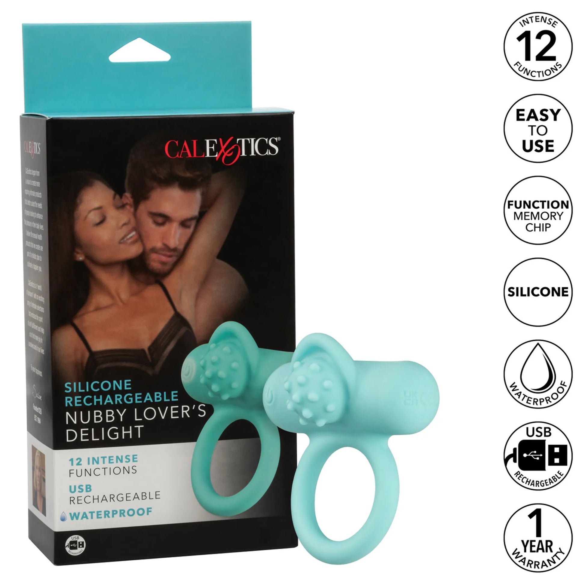 Silicone Recharegable Nubby Lover's Delight Couple's Enhancer Ring from California Exotic Novelties. The Silicone Rechargeable Nubby Lover's Delight mixes 12 intense functions of vibration with an erotically nubbed surface for even more knee shaking pleasure. The stimulating nubbed surface, uniquely shaped teaser and 12 functions of vibrations are here to deliver intense pleasure. This stimulator ring is great for beginners looking to spice things up or erotic experts looking to add intense pleasure to their arsenal. The plush body safe Silicone ring works to improve stamina and girth to make your lover moan for more, more, more. The tight ring maximizes sensitivity and elevates sensation throughout letting you enjoy longer, more powerful pleasure. While you reach next level pleasure, the 12 vibration functions and curved tickler will leave both partners in a state of orgasmic bliss. The ergonomically shaped stimulator and nubby teaser deliver pinpoint pleasure on your most intimate sweet spots. Take this waterproof ring for a dip and embrace those powerful vibrations anywhere you want to get wet. This passionate cock ring remembers exactly how you like it with the state of the art memory chip and can pick up on the last function used. Recharge your pleasure in no time with a charge time of 1.5 hours and enjoy playtime for up to 80 minutes. Specifications: SKU SE-1841-22-3. Color Blue. Power Source USB. 1 year warranty. Material type Silicone. Features: Phthalate free, Waterproof vibrating cock ring, Rechargeable vibrations, Vibrates. Measurements 2.75 inches by 3 inches Couple's Enhancer Ring. 1.5 inches Ring diameter. Bulk weight 1.7 ounces. Package 2.8 ounces. _x005F_x000D_Package2 inches by 4 inches by 8.5 inches. Catergoires: Vibrators, Sex Toys for Couples, Love Rings, Couple's Cock Rings, Vibrating Love Rings, Eco-Friendly Sex Toys, Rechargeable Vibrators. 2023.