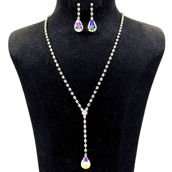 - This modern rhjsonstone necklace set features a single dangle pear design for an elegant touch.