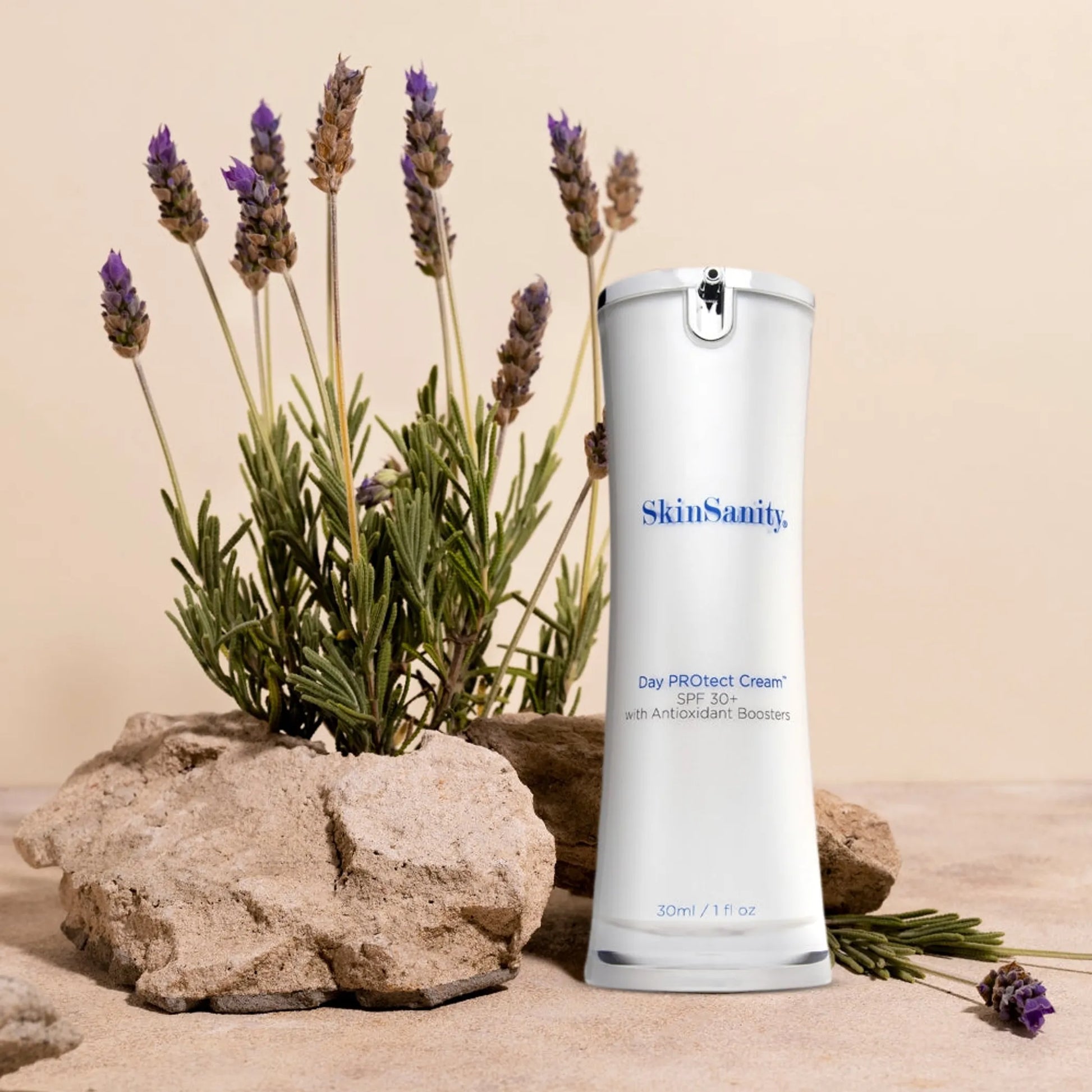 SkinSanity Day Protect Cream SPF 30+ with Antioxidant Boosters. A luxurious broad spectrum super, age-defying, moisturizer with SPF 30 sunscreen for your facebecause we all know that sun protection is the most important anti-aging ingredient. This little beauty includes a proprietary mixture of antioxidants, anti-irritant and anti-inflammatory agents, to defend cells against accelerated aging. This product is very concentrated, and if desired, you can thin with any of our serums. All our clean beauty products are vegan, cruelty-free, made with organic and natural ingredients, gluten-free, and great for the planet.