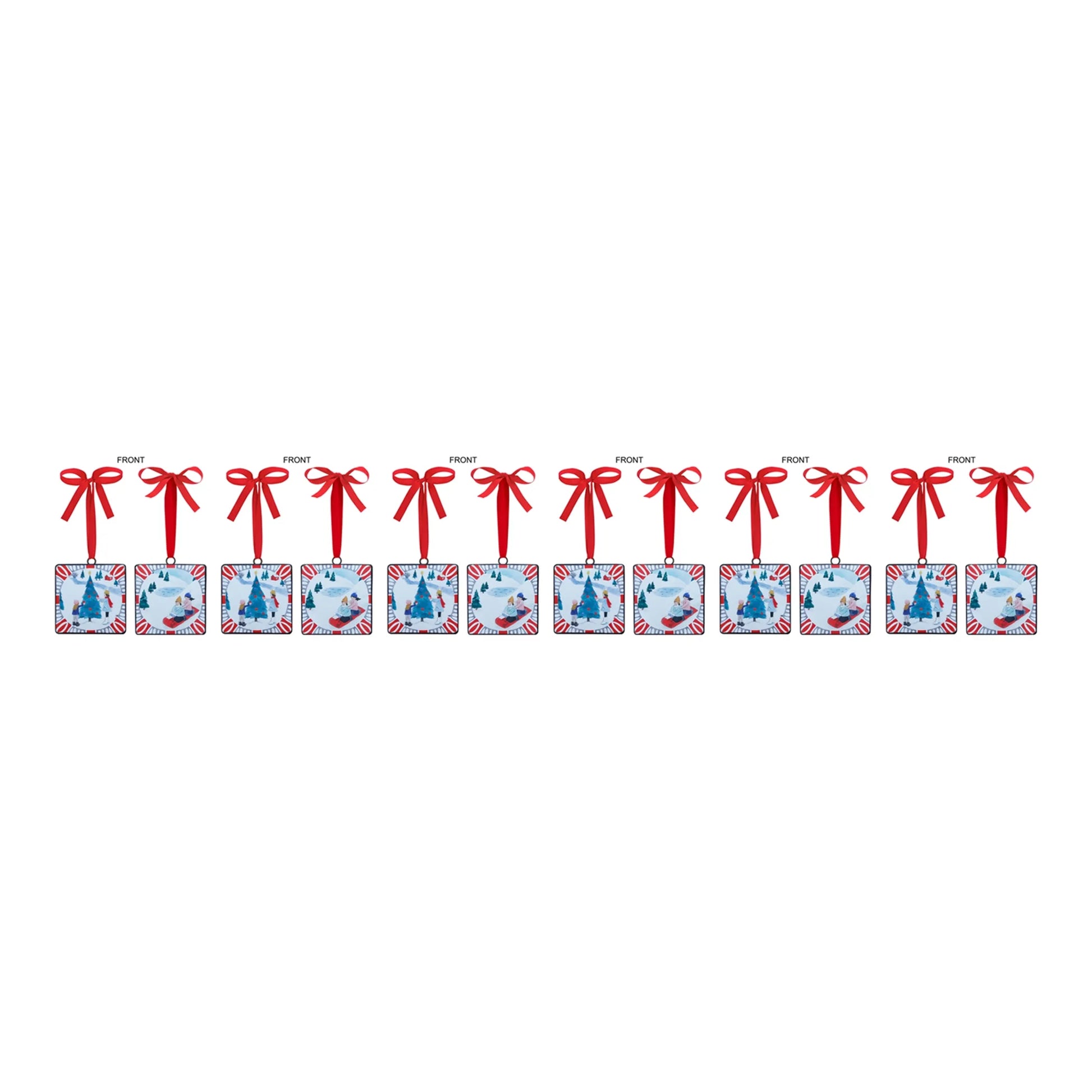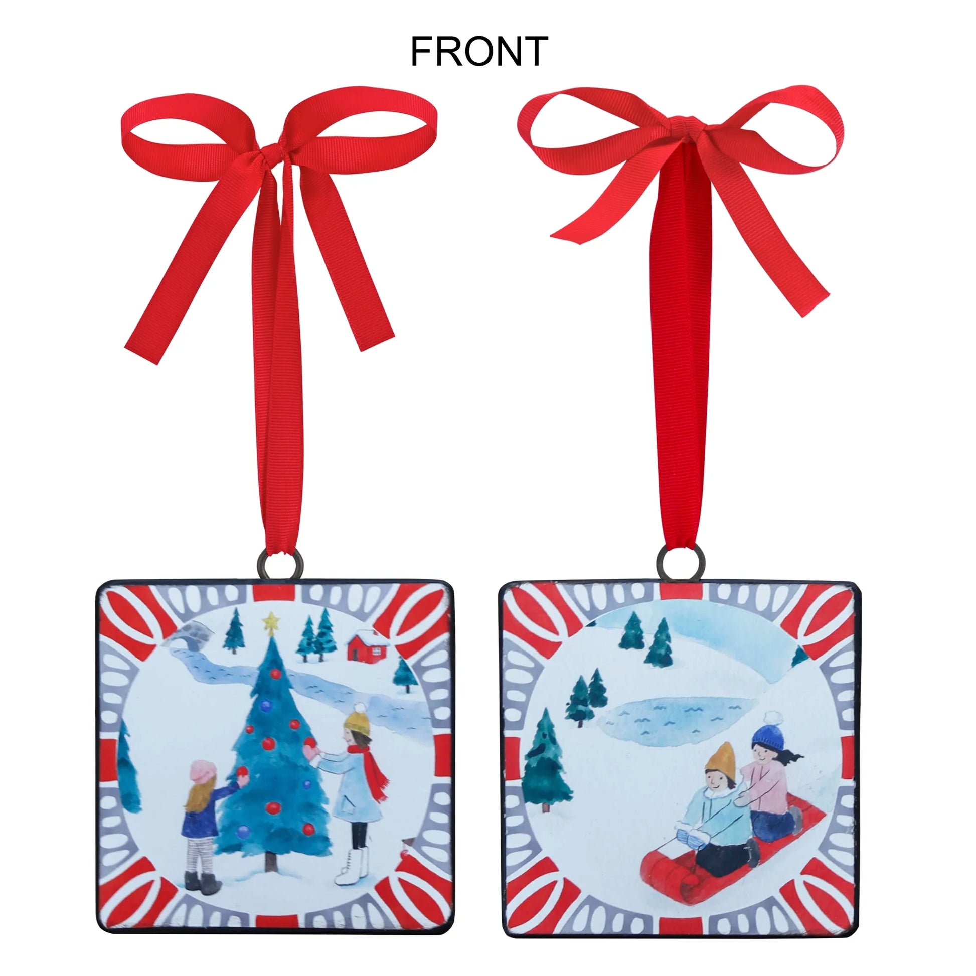 Add a playful touch to your Christmas tree with this set of Sledding and Tree Ornaments. Whether you're adding a touch of cheer to your home or gifting to a loved one, these ornaments will definitely bring smiles to your home. With festive red and white tones, kids sledding and decorating tree designs, and a quality iron metal construction, these joyful decorations are sure to last for years to come! The red ribbon hanger is the perfect finishing touch. Add a little something special this holiday season with this memorable set of ornaments.