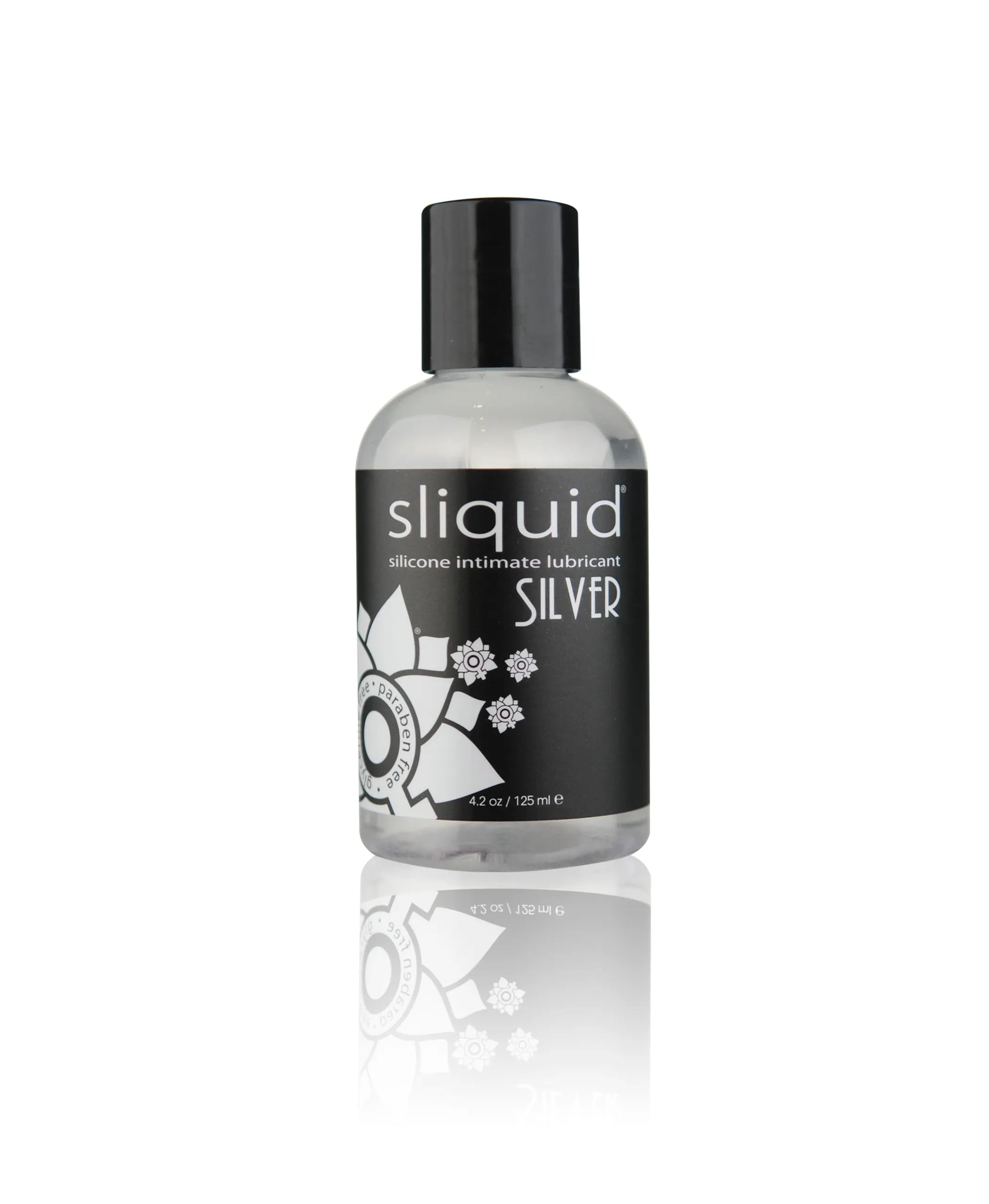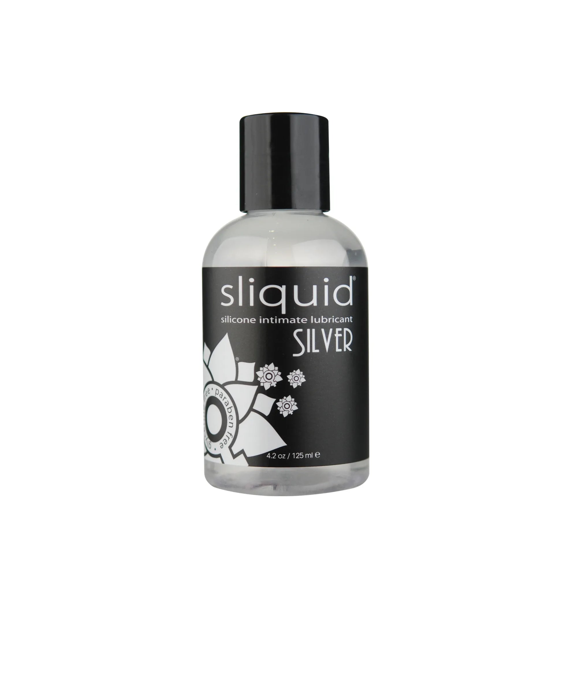 Sliquid Silver Premium Intimate Lubricant 4.2 fluid ounces. Sliquid Silver is a natural lubricant is a glycerin free and paraben free line of female friendly personal lubricants and intimate bath & body products made especially for women. Sliquid Silver Intimate Lubricant is long lasting and made from the highest grade, ultra concentrated Silicone. Glycerin free, Paraben free. Blended to identical specifications as the German imports. Non-staining, not tested on animals, and latex friendly, Sliquid is formulated to last longer than most Hollywood marriages. Features: hypoallergenic, fragrance free, waterproof, great for sensual massage. Latex condom compatible. Not for use with some Silicone based products. Ingredients: Dimethicone, Dimethiconol, Cyclopentasiloxane. Sliquid from Dallas, Texas. Made in the USA. Categories: Lubricants, Silicone Based Lubricants, Sex Toys for Couples, Health and Beauty Aids. Restricted, Amazon Restricted. 2022.