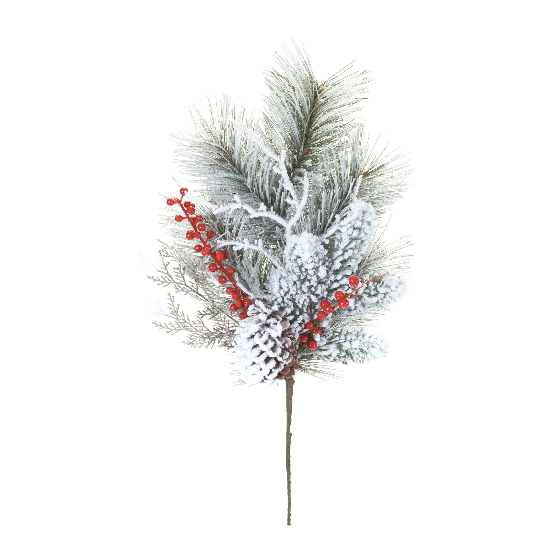 Add a touch of nature to your holiday d?cor with this beautiful set of Snowy Pine with Berry Spray. Featuring 2 pieces, this set is a great accent to your Christmas tree, holiday porch pot, or tabletop vase arrangement. The wintry green and white tones paired with the berry and snowy flocking accent is the perfect combination to create a memorable display. The quality pvc composition is sure to endure for seasons to come. Complete your holiday decor with this stunning set of Snowy Pine with Berry Sprays!