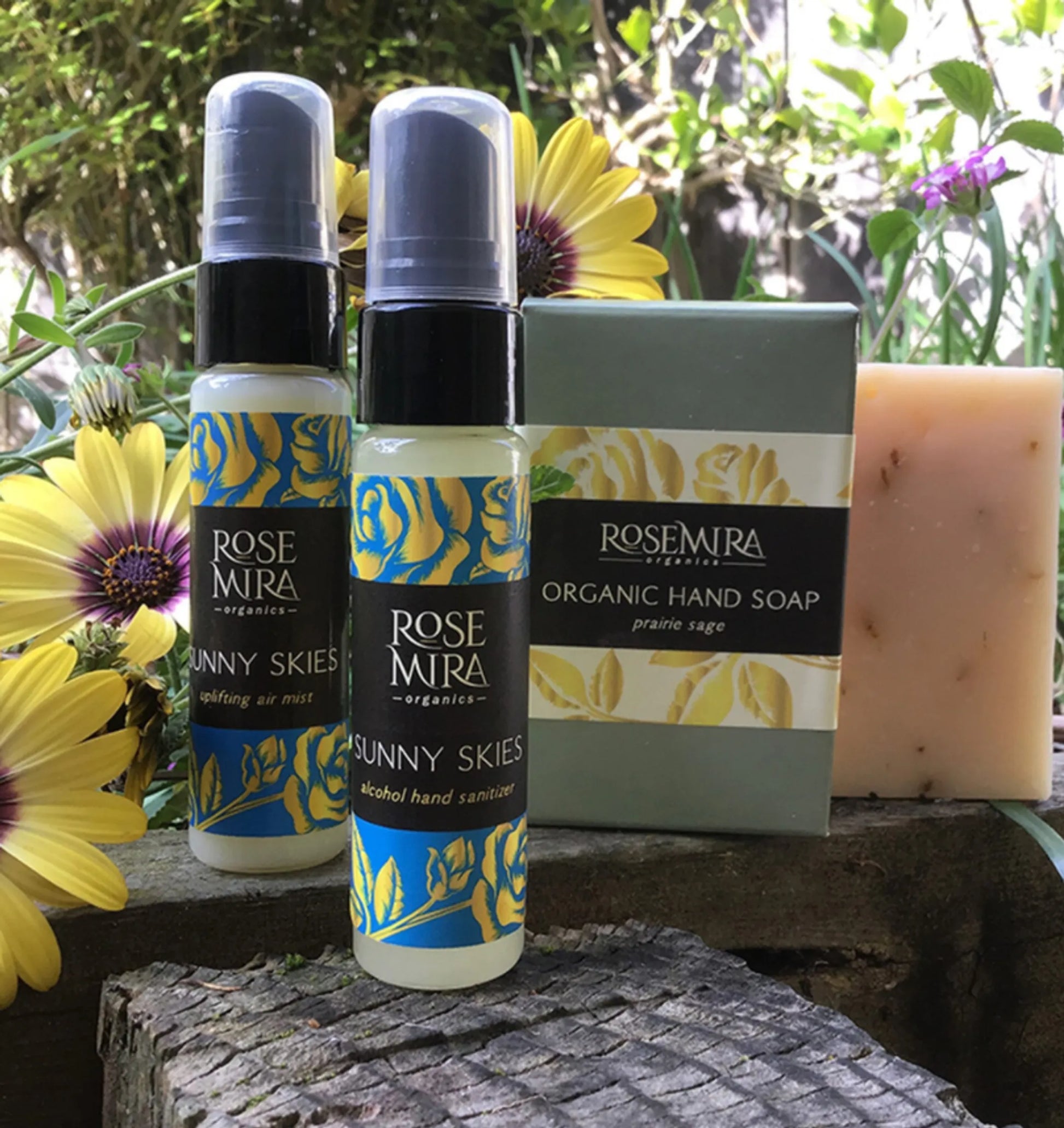 A lovely collection of timely cleansing products including Alcohol Spray Sanitzer, Air Mist, Organic Bar of Soap.