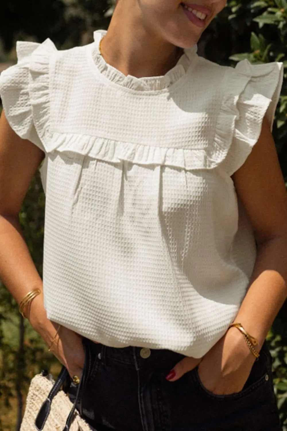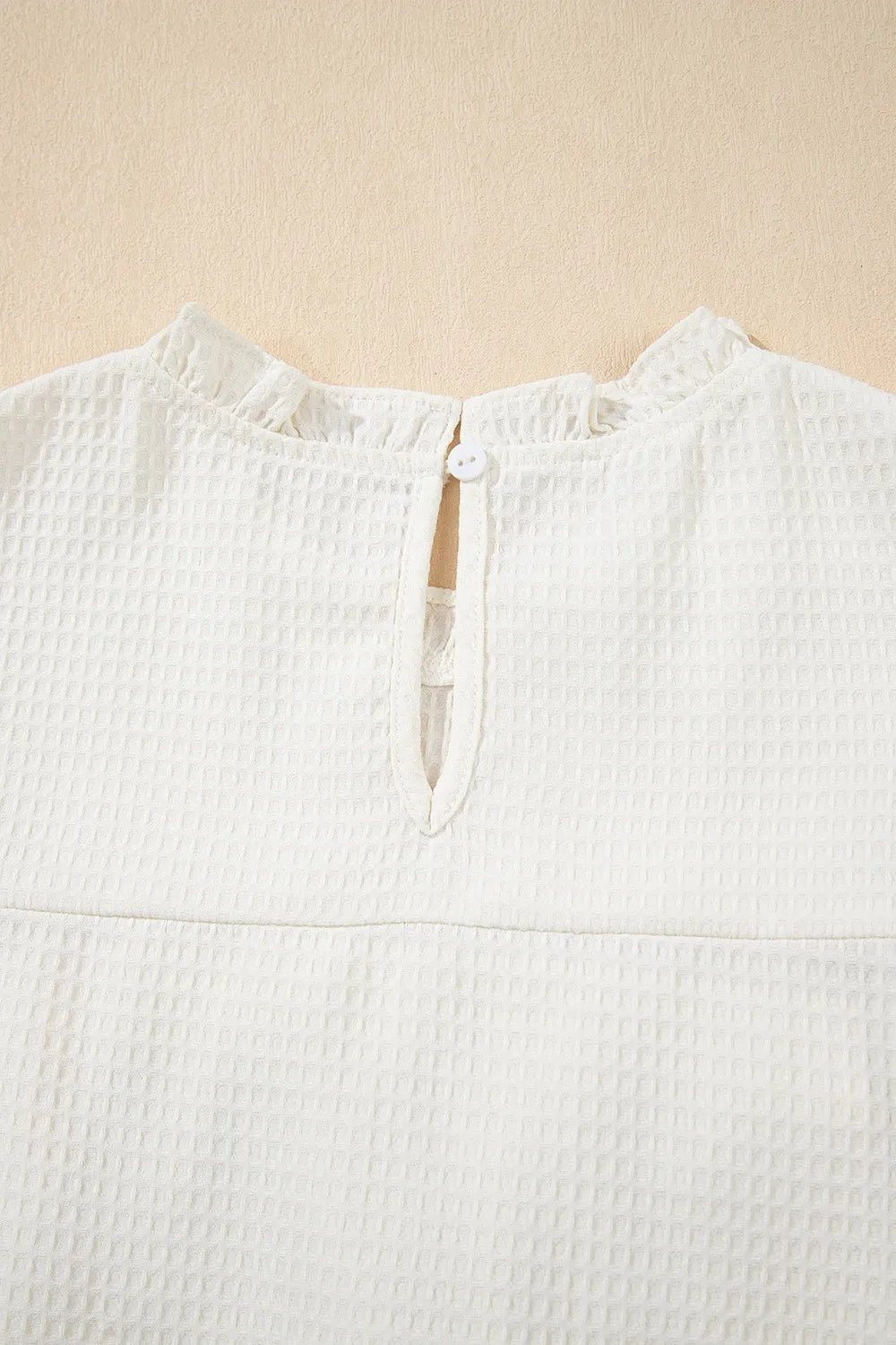 Solid Color Ruffle Trim Waffle Knit Blouse