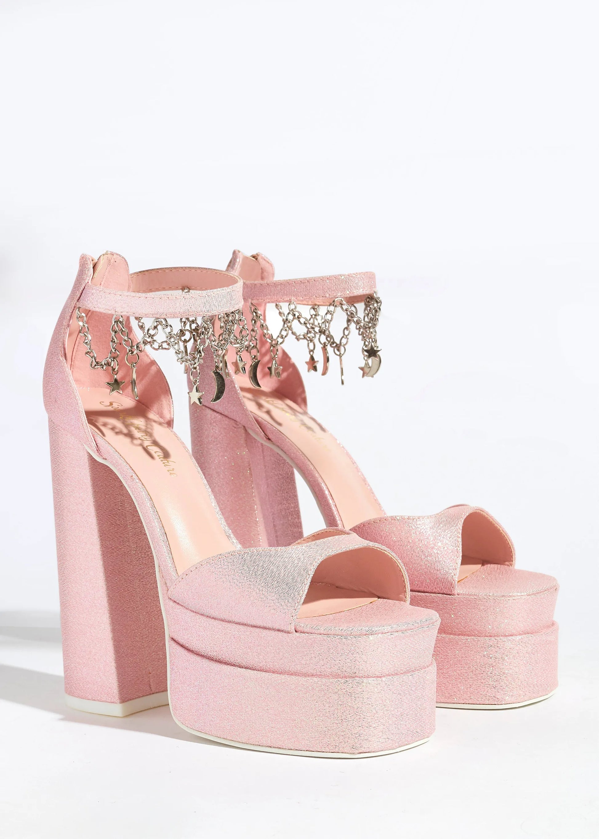 - Star and Moon Charm: Adorned with a silver-tone ankle chain featuring a star and moon charm, these heels add a whimsical and magical element to your style.