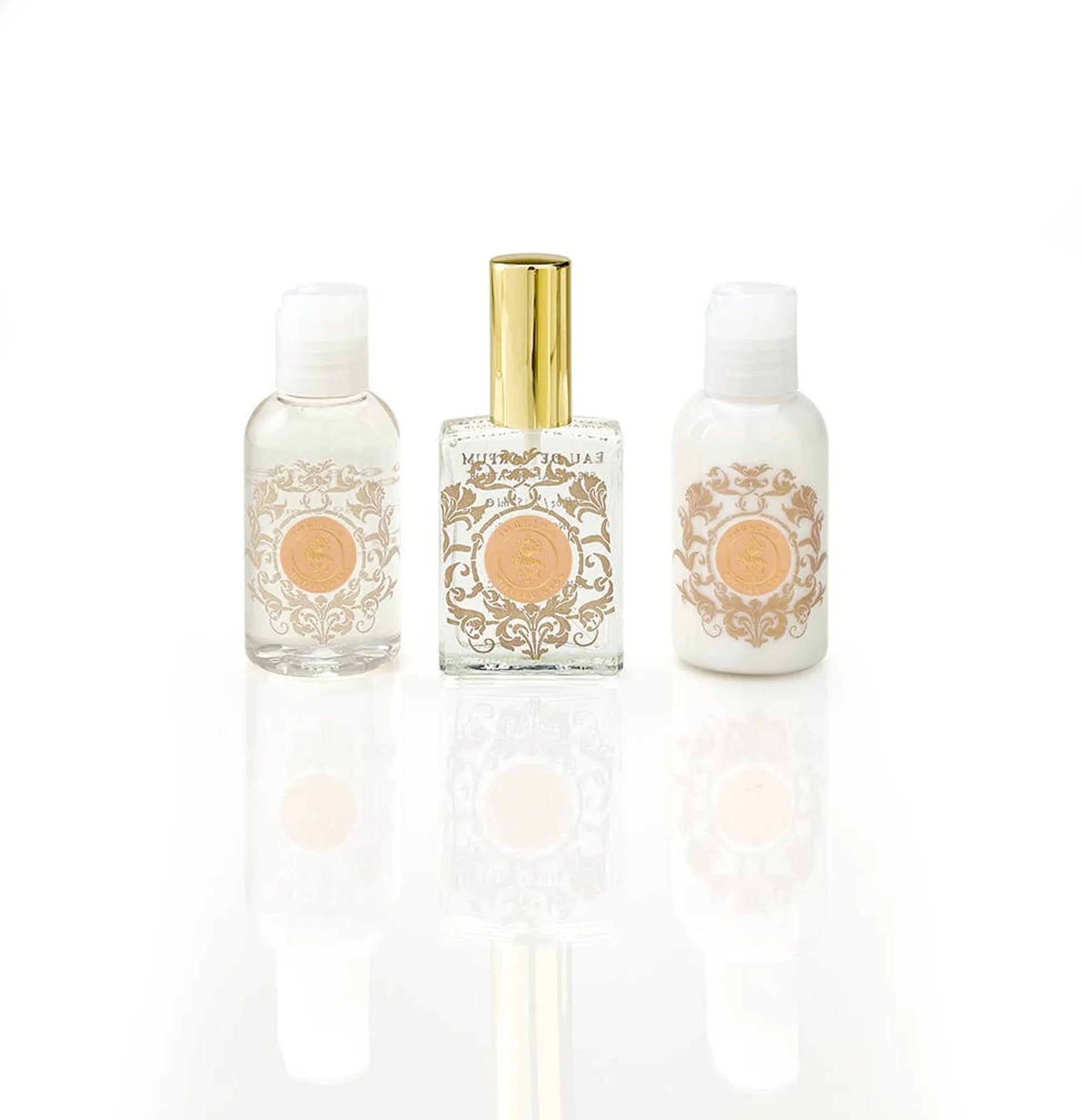 Our version of the perfect gift. Travel size, 1 oz Parfum, 2 oz Amenity Lotion, and 2 oz Amenity Shower Gel. Packaged in a beautiful cream and gold gift box with ribbon.