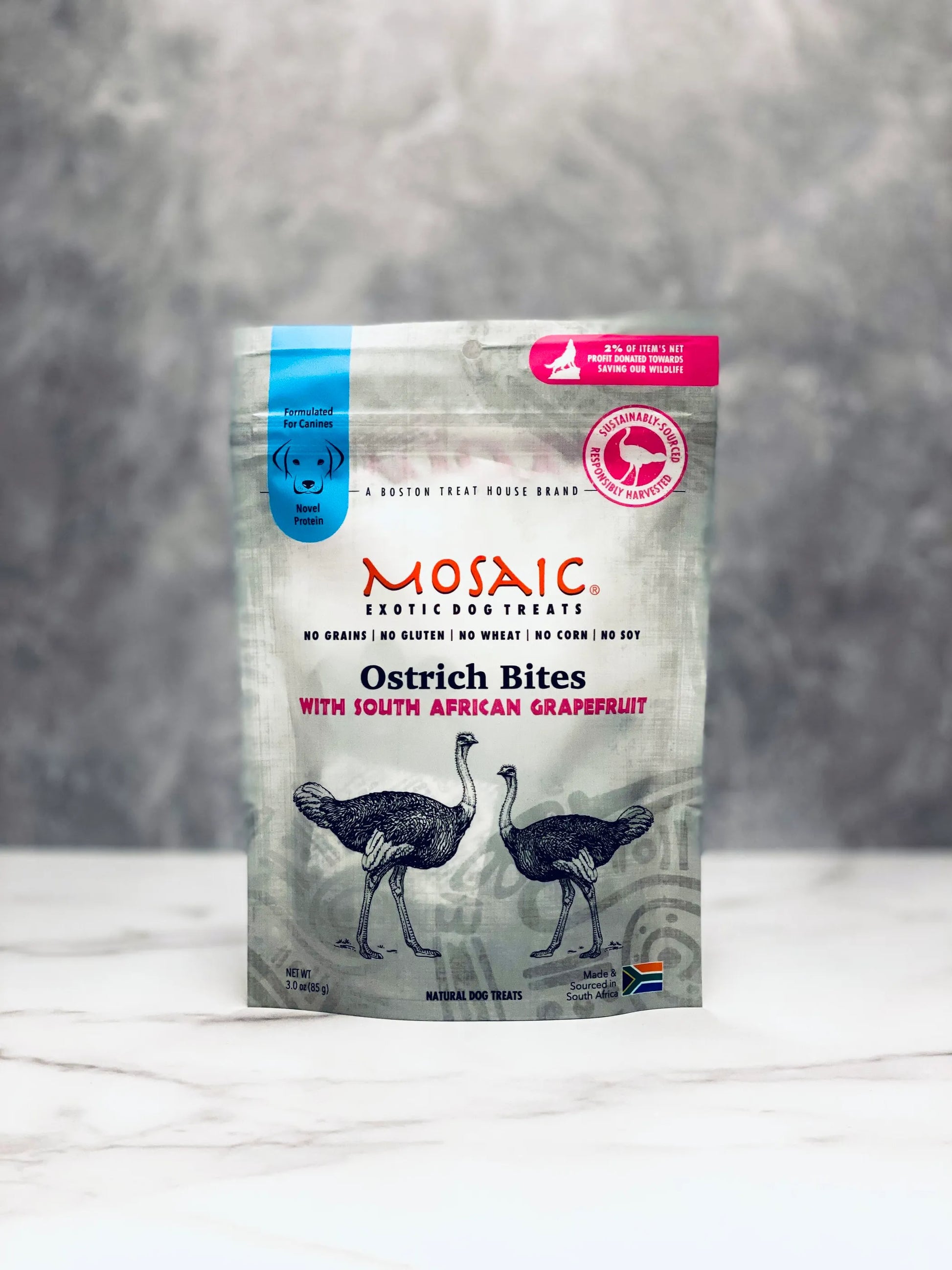 Mosaic South African Ostrich Bites are a perfect alternative for dogs that are affected by food allergies from common proteins, such as chicken, beef, and pork. These limited-ingredient, tasty treats are low in fat and low in calories, which may benefit dogs that suffer from weight control issues. Our exotic training treats are infused with South African grapefruit extract, which offers antibacterial, antiviral, antiparasitic, antifungal and antioxidant properties.
