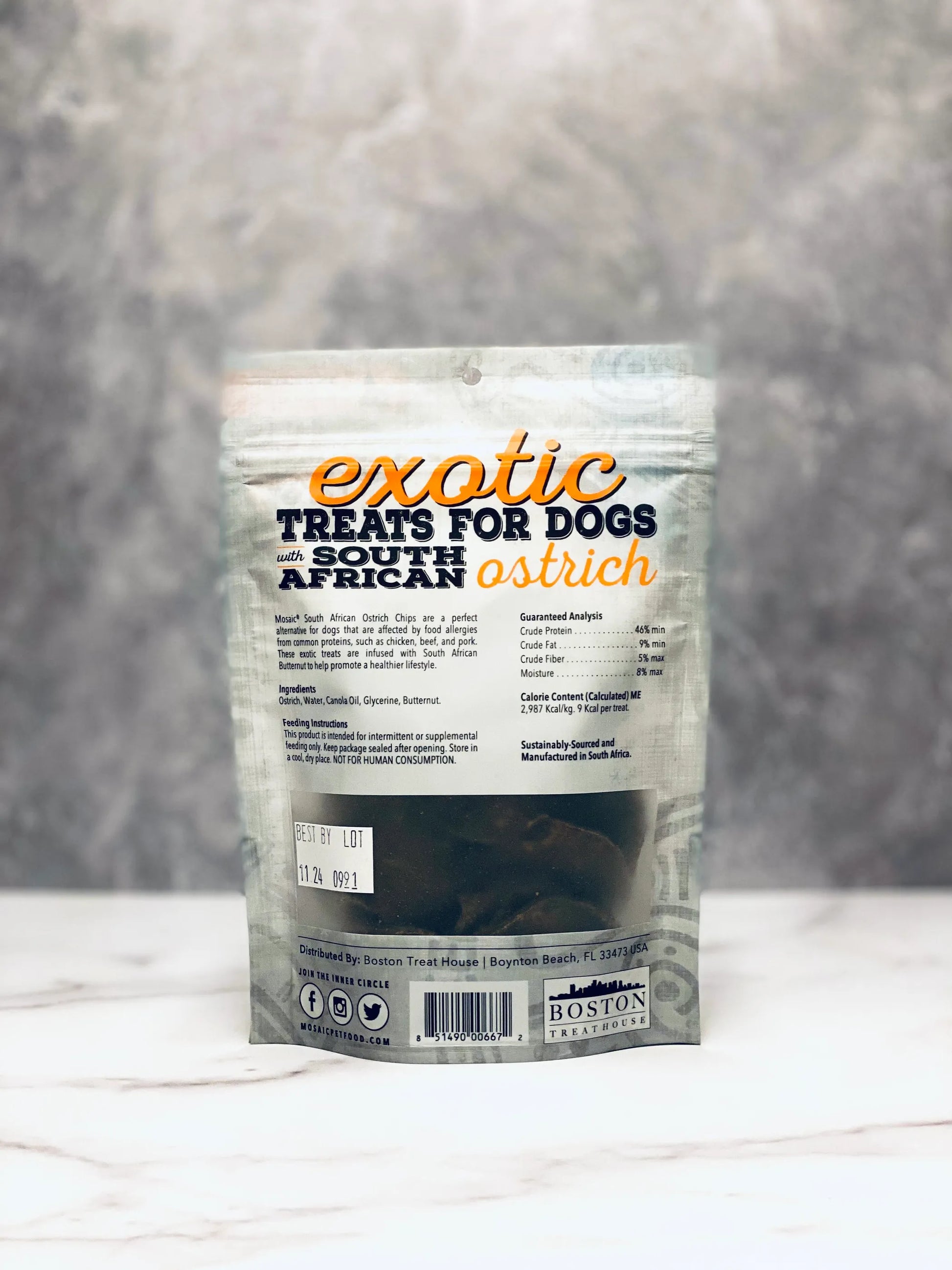 Mosaic South African Ostrich Chips are a perfect alternative for dogs that are affected by food allergies from common proteins, such as chicken, beef, and pork. These limited-ingredient, tasty treats are low in fat and low in calories, which may benefit dogs that suffer from weight control issues. Our exotic chips are infused with South African butternut, which is rich in vitamin A, vitamin C, fiber, and potassium.