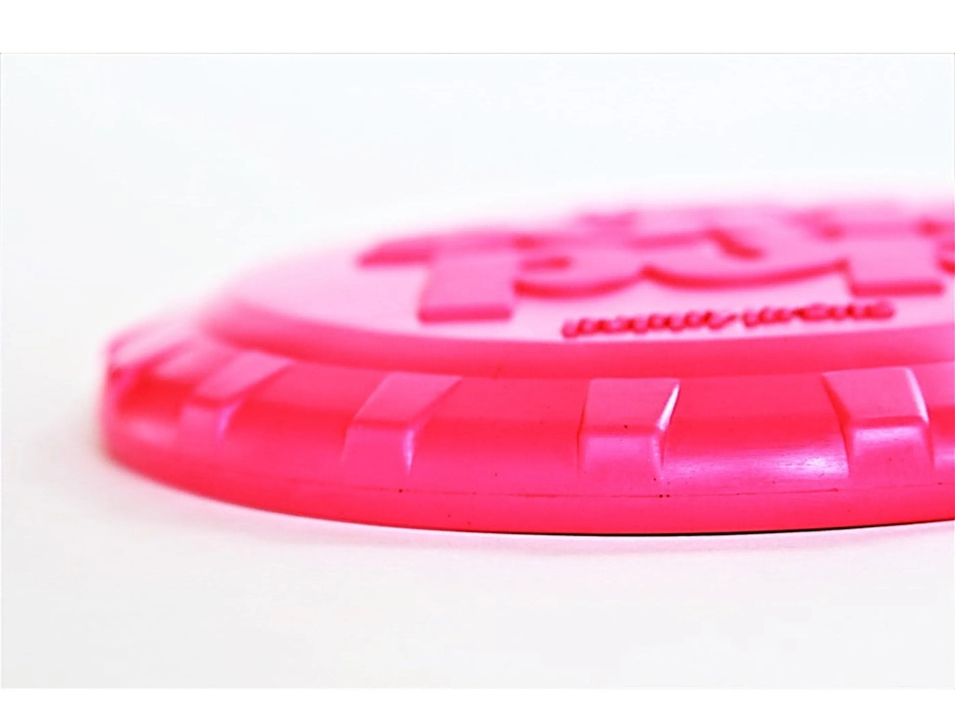 PUPPY FRISBEE: Durable natural rubber flyer for retrieving with your dog. Won't harm dog's teeth and gums like plastic frisbees.