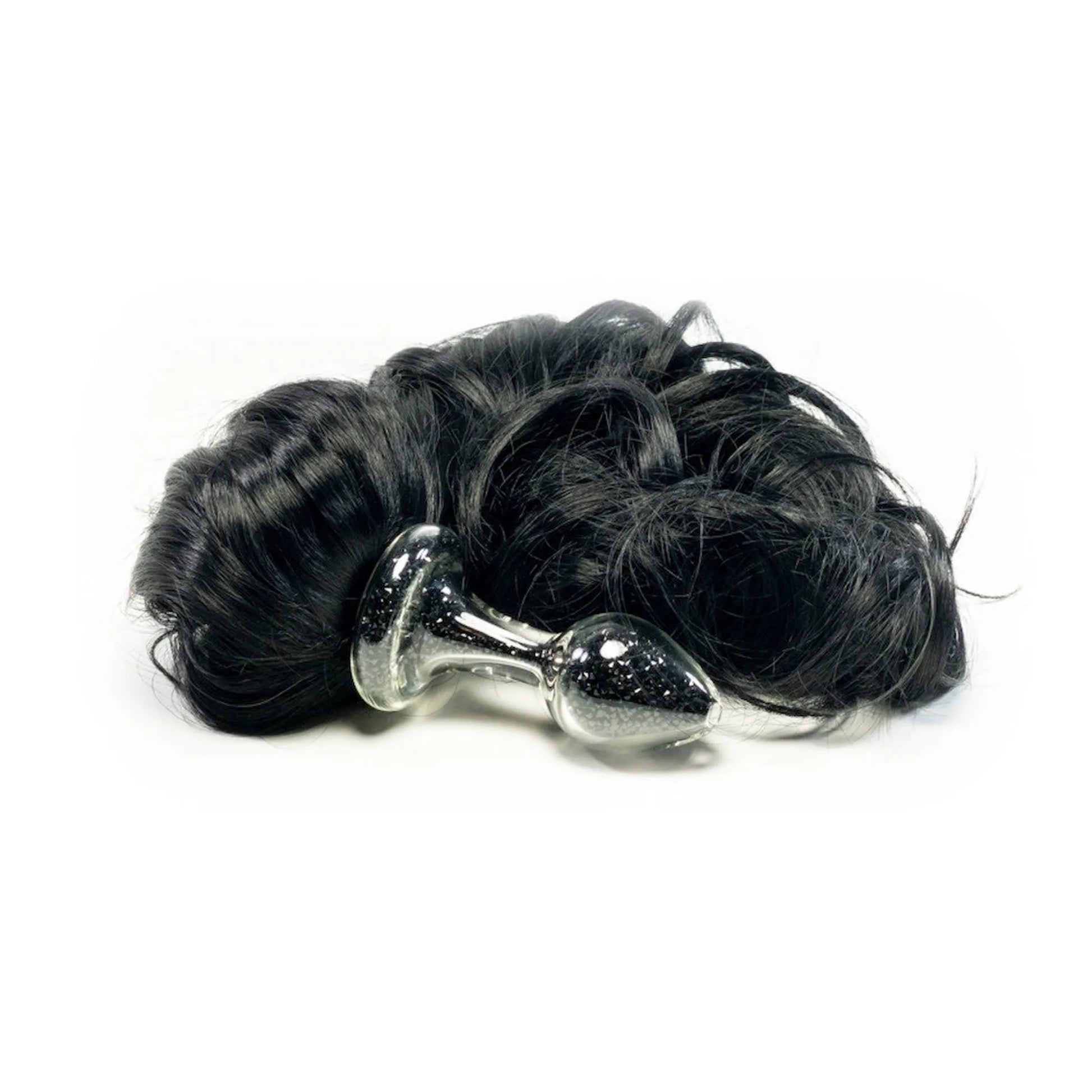 Our Sparkle Ponytail Plugs use an innovative screw-in (and out) base. They have the exact same look and feel of our standard small bulb- short stem plug, but with the added convenience of being able to remove the ponytail from the base. The hollow glass plug is made from borosilicate tubing just like our dilators are made with. Then we fill the plug with tiny crystals and seal it with a screw-on base. Screw-in one of our high-end ponytails and let the fun and horsing around begin.