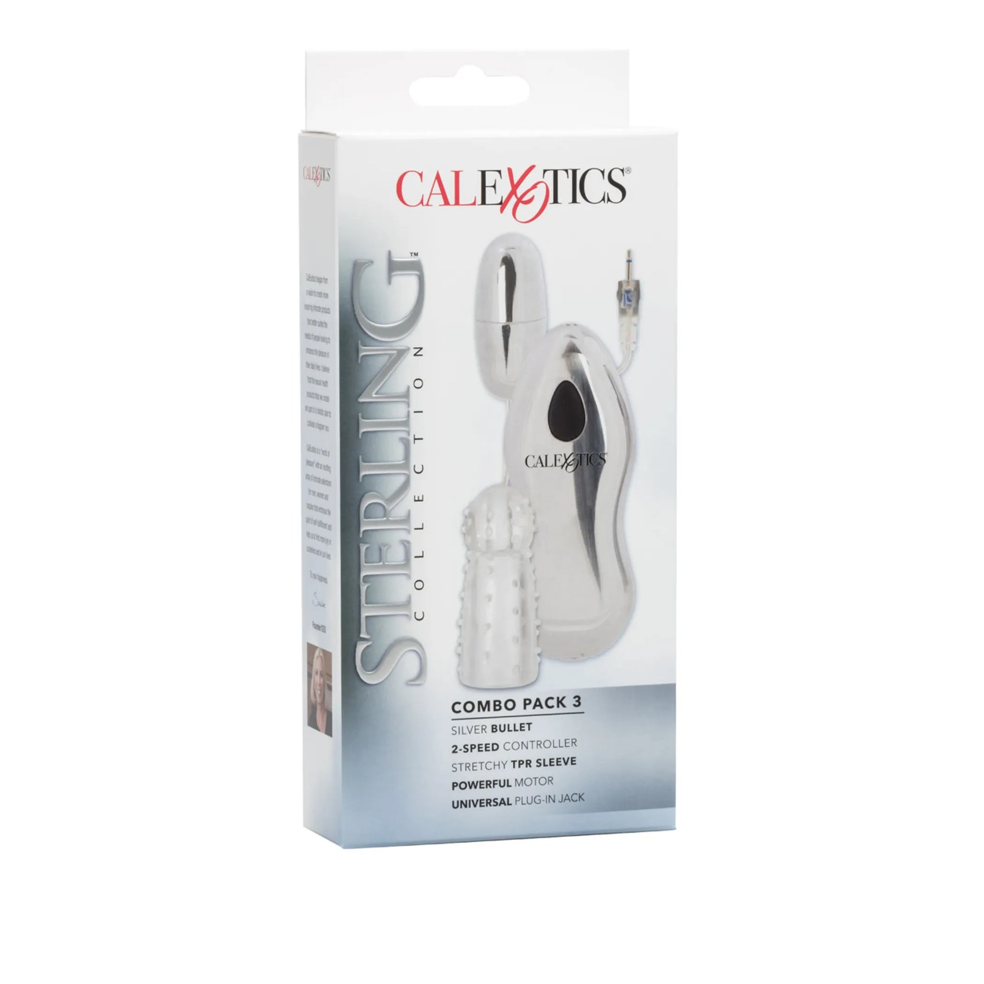 Sterling Collection Combo 3 Siver Bullet Vibrator with 2 Speed Controller Plus Sleeve from California Exotic Novelties. Sophisticated women deserve sophisticated choices to match their style and deliver on their every desire. With the Sterling Collection, creating your dream sex toy is easy. This Collection is the first Interchangeable Collection of Controllers, Plug in Jacks and Bullets that are available in individual packaging for mix and match fun or in pre-designed sets for carefully planned, optimum pleasure. The Combo 3 Pack Combo is equipped with everything you need to indulge in heavenly textured, powerfully charged, vibrating bliss. You will love the gleaming Silver design that is pure seductive allure. The Controllers carefully placed curves make switching speeds or clenching it in your palm with ecstasy, an incredibly comfortable experience. Its single Plug in Jack makes mixing and matching your stimulators simple. The Bullet Vibrator is packed with a wonderfully powerful motor for such a petite sex toy. Two speeds of vibrating, teasing and pleasing sensation are at your service. Massage your lips or tease your clit exactly the way that drives you wild. When you are feeling creative, just Plug the Bullet Vibrator into a new Controller and explore an array of totally new sensations. And, when you feel like treating yourself to a totally fresh orgasmic experience, just slip on the super soft and wonderfully stretchy Bullet Vibrator Sleeve. It features pleasure bumps that will have you immersed in toe curling pleasure in no time. Just insert 2 AA batteries and you are ready to pamper yourself with pleasure. Indulge in true elegance with this combination pack. Powerful 2 speed push button Controller with single Plug in Jack. Soft and stretchy Bullet Vibrator Sleeve with pleasure bumps. Standard Silver Bullet is made using phthalate free, non-toxic materials: ABS Plastic with a Silver Plating Bullet Vibrator and Controller, Thermoplastic Rubber TPR Sleeve. Vibrating sex toy requires 2 AA batteries, not included. Do not leave batteries in the vibrator between uses. Controller measures 4.5 inches long by 1.75 inches wide, Bullet Vibrator measures 2.2 inches long by 1 inch wide. Bulk weight: 2.8 ounces. Always clean before and after use. Sterling Collection Combo 3 is a registered trademark for California Exotic Novelties. Sex toys and sexual wellness. Categories: Vibrators, Bullets, Eggs, Sex Toys for Women, Vibrating Bullets and Eggs. 2023.