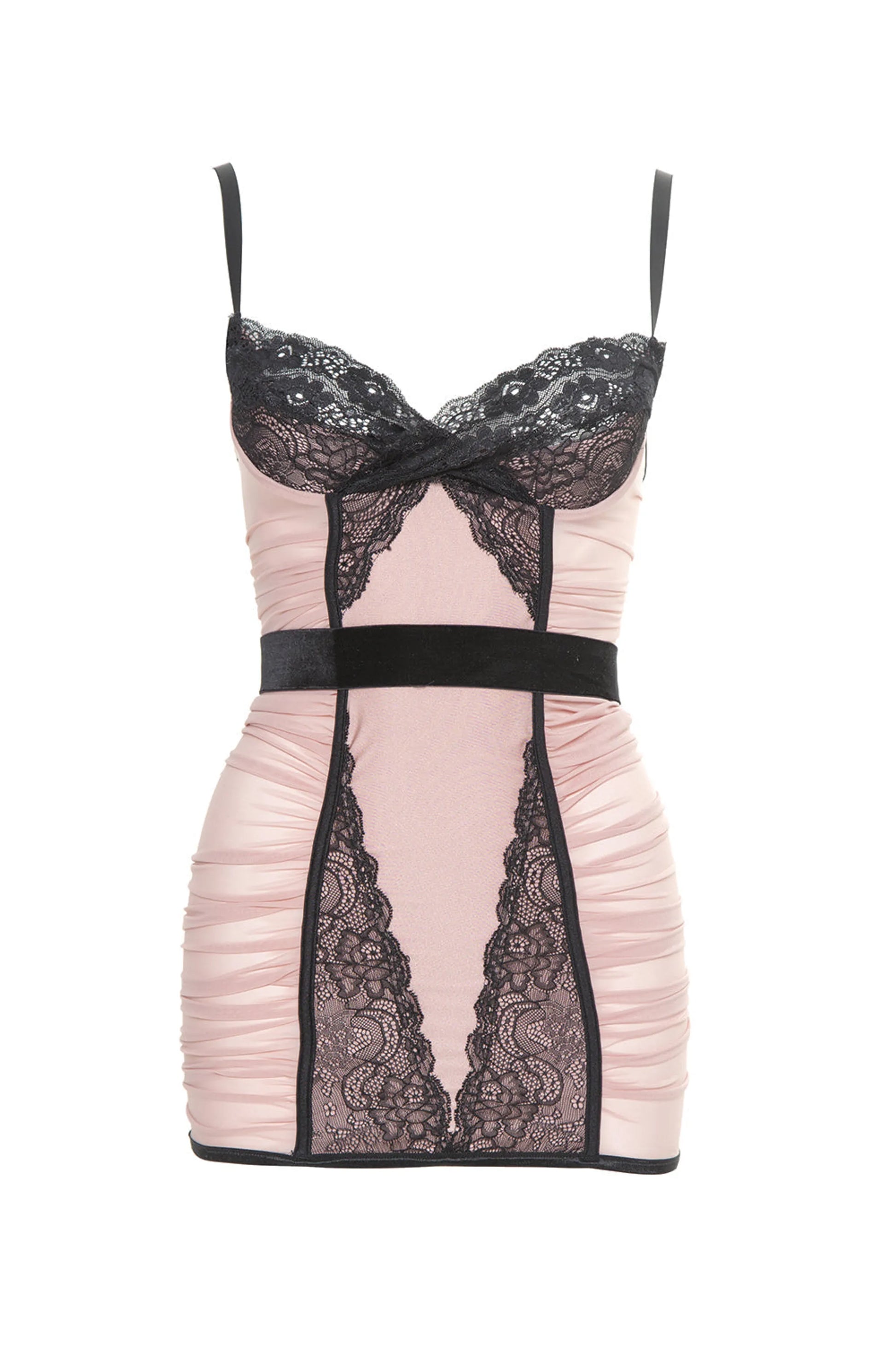 Mesh and knit chemise with lace peek-a-boo padded demi cups, lace accents and gathered mesh side panels. This chemise has a removable belt and garters.