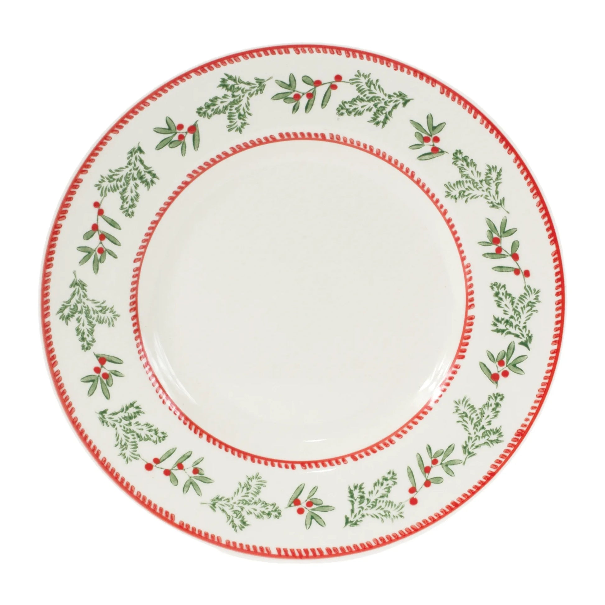 Make your holiday decorating come alive with this set of four Mistletoe Plates! Featuring a white finish with red accents, these stoneware plates are adorned with a beautiful painted mistletoe & pine branch design. The traditional holiday decor will bring joy to any house and make your guests feel welcome. Add a touch of cheer to the holidays and get your set of Mistletoe Plates today!