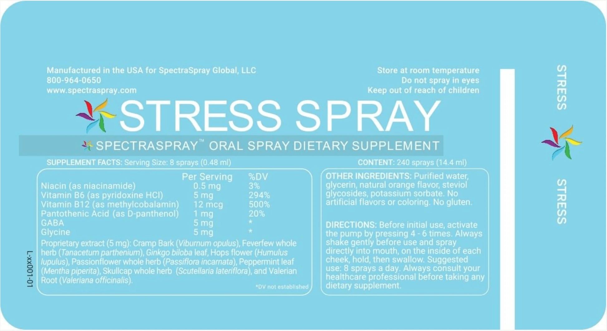 SpectraSpray Stress Spray is an easy to use vegan oral spray to help 'take the edge off' during your stressful day. Direct absorption gives you fast results. Take it anytime, anywhere with no need for food or water. A unique combination of B vitamins & well studied stress reducing herbs.